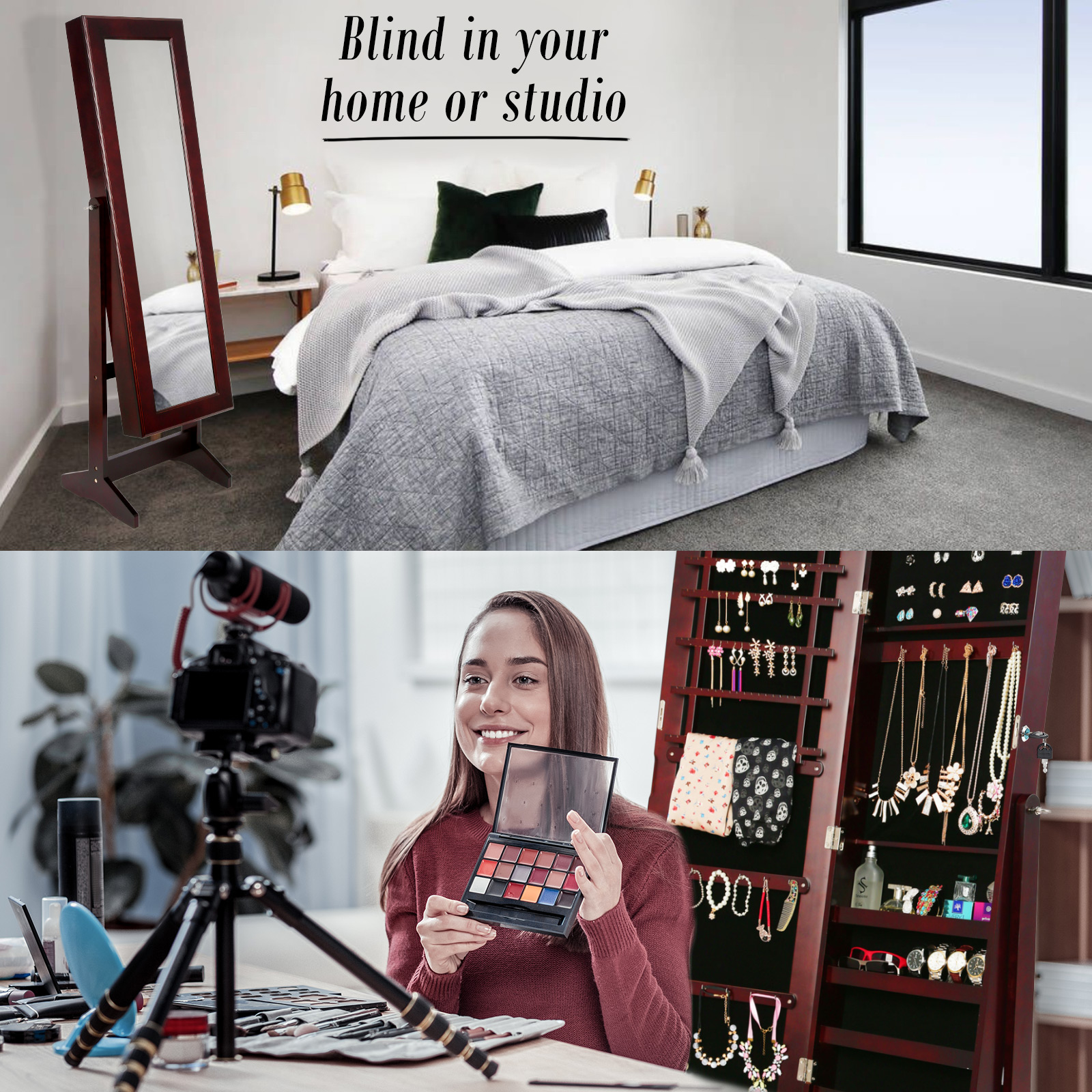 This mirror jewellery cabinet combines functionality with a sleek, modern design, providing a compact storage solution for your accessories while serving as a full-length dressing mirror. Its stylish appearance makes it suitable for various room settings, helping to keep your jewelry organized and your space tidy.