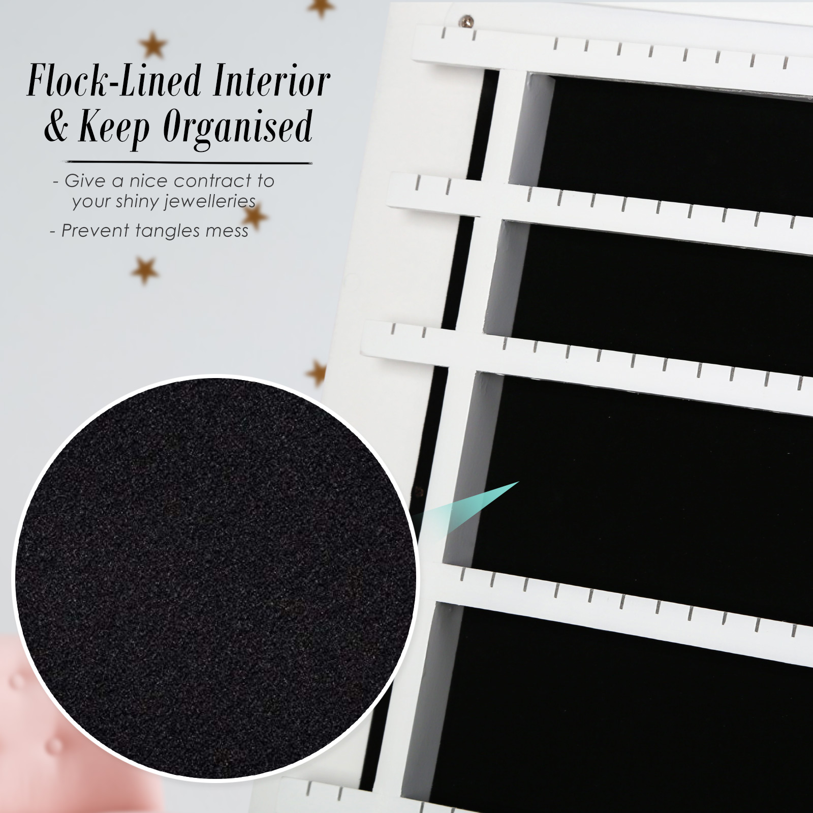 Features include multiple earring hangers, necklace hooks, ring slots, and shelves to facilitate easy organization and access to your jewellery. The interior is lined with black flocking to enhance the display of your shiny accessories. The mirror can be tilted to different angles for convenience, and a catch bar prevents it from tilting too far forward. The cabinet is constructed from durable wood composites and veneers for long-lasting use.