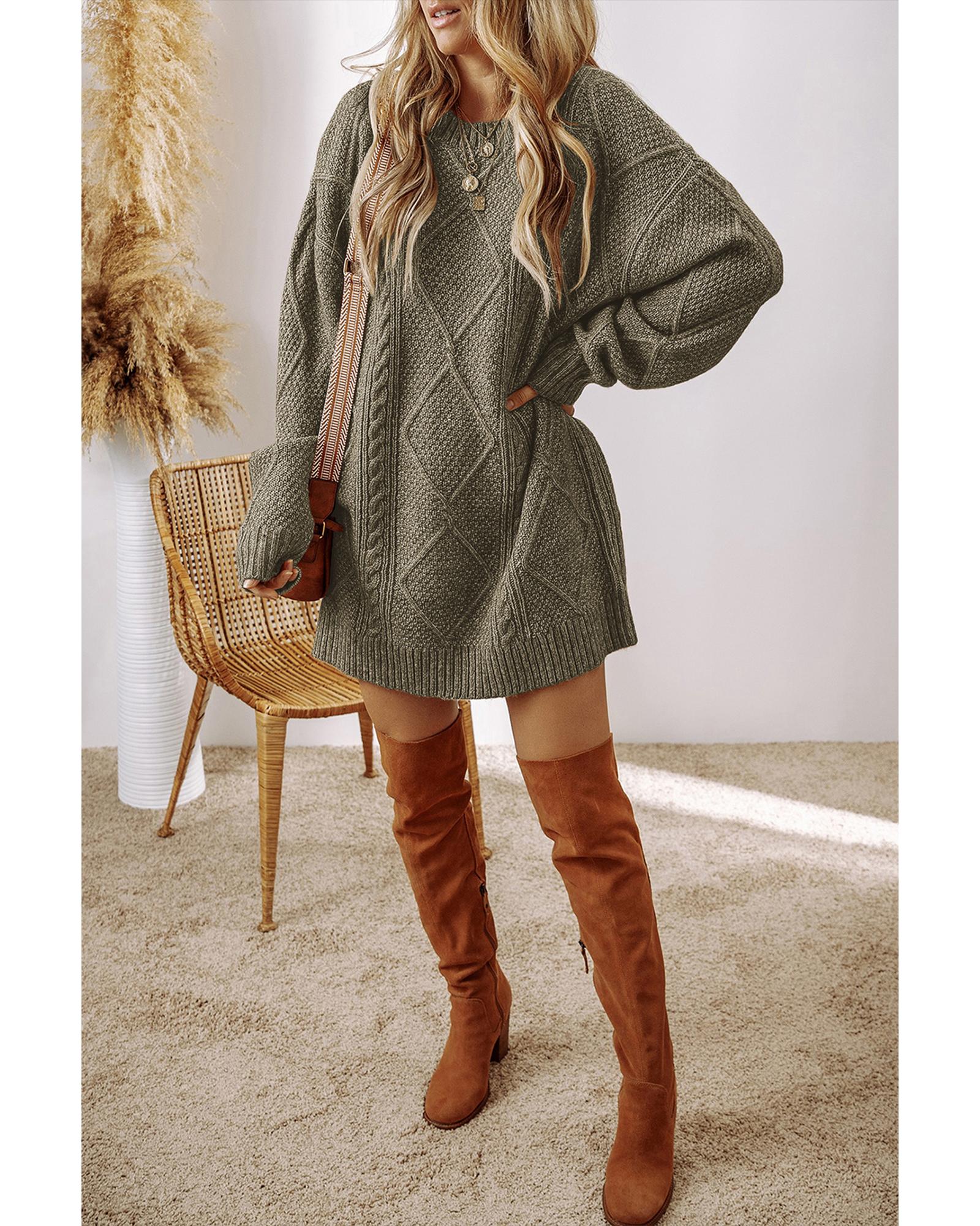 This sweater dress features a cozy cable knit design combined with a relaxed fit, making it a versatile addition to any wardrobe. Its drop shoulder style adds a casual yet stylish touch, suitable for various occasions and easy to dress up or down.