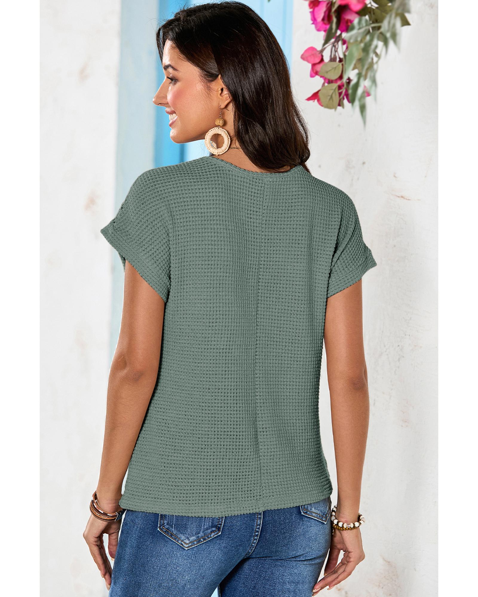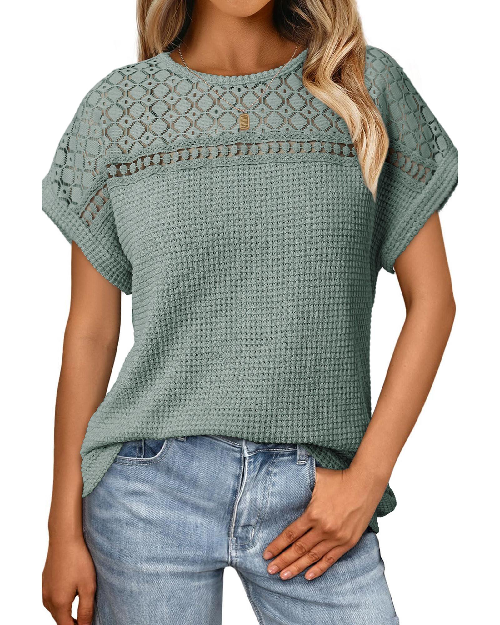 This short sleeve top features a delicate lace patchwork design combined with a waffle texture, creating an elegant and visually appealing look. Made from soft and breathable fabric, it offers comfort and versatility for various occasions, especially suitable for warm weather.