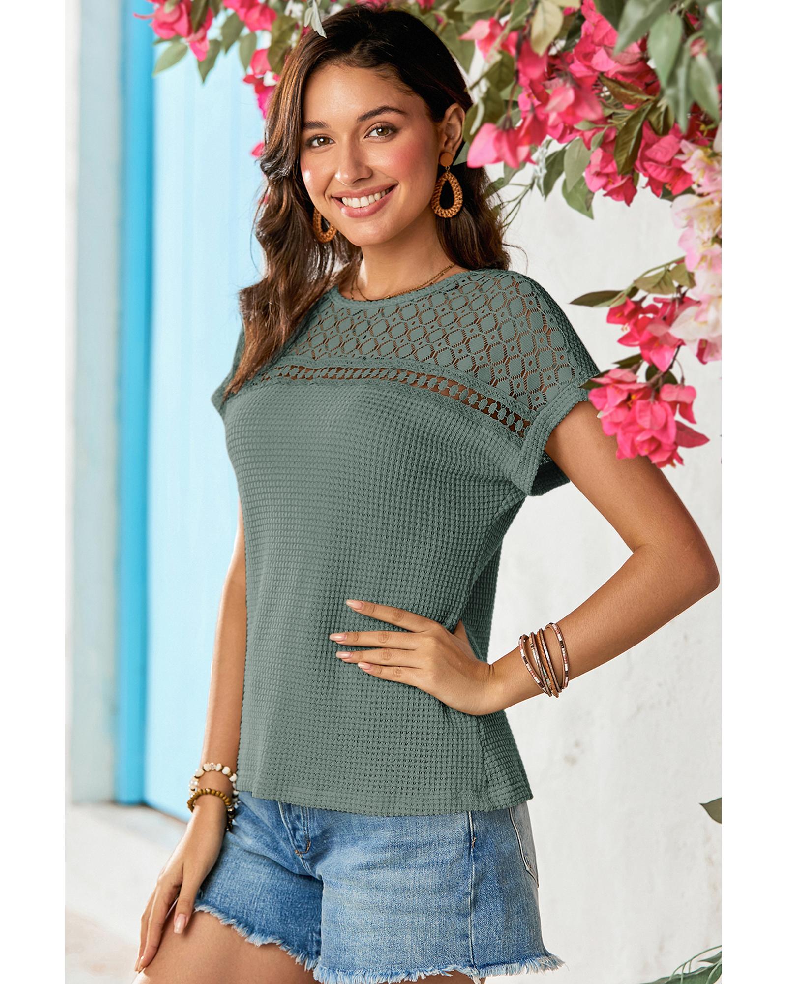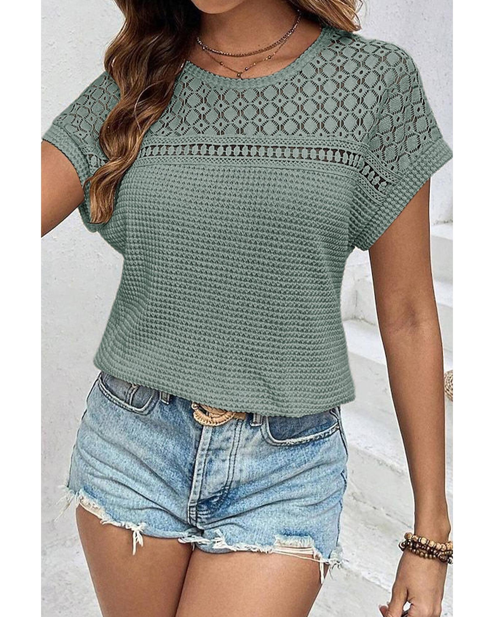 This short sleeve top features a delicate lace patchwork design combined with a waffle texture, creating an elegant and visually appealing look. Made from soft and breathable fabric, it offers comfort and style suitable for various occasions, especially in warm weather.