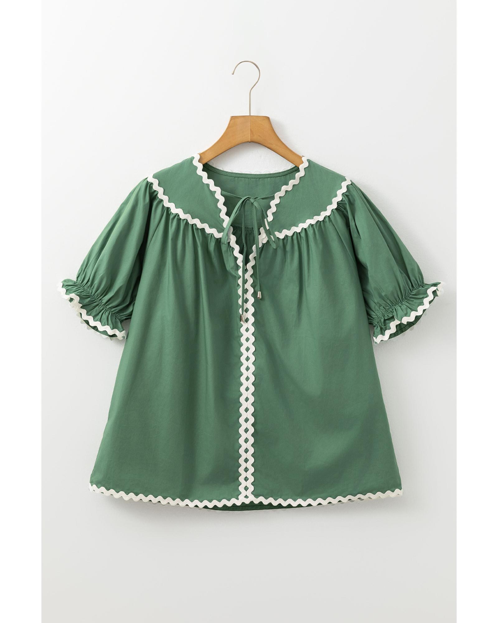 Mist Green Ric Rac Trim Tie Split Neck Short Sleeve Blouse – S