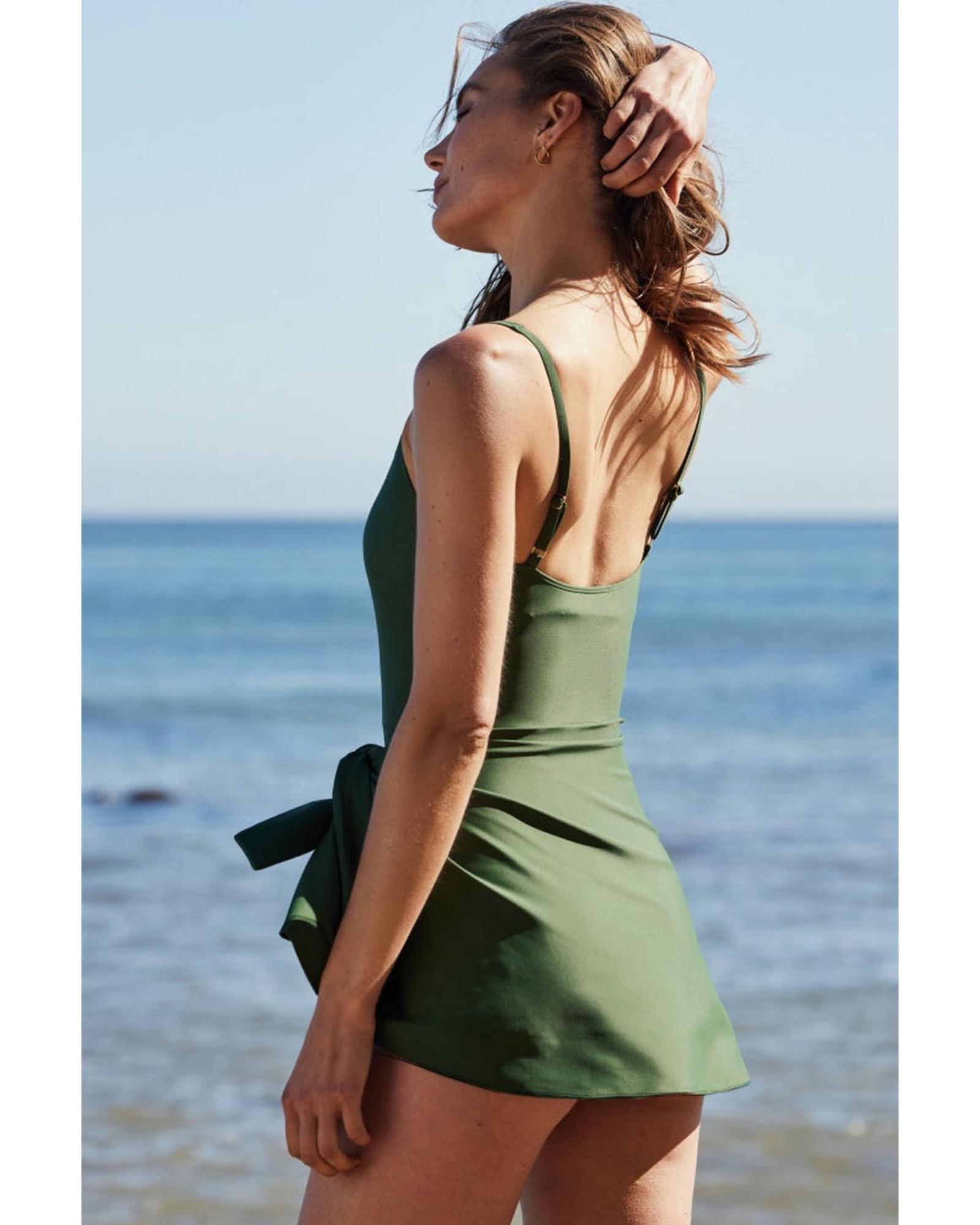Mist Green Side Tied Waist Square Neck Adjustable Straps A-line One Piece Swim Dress – L