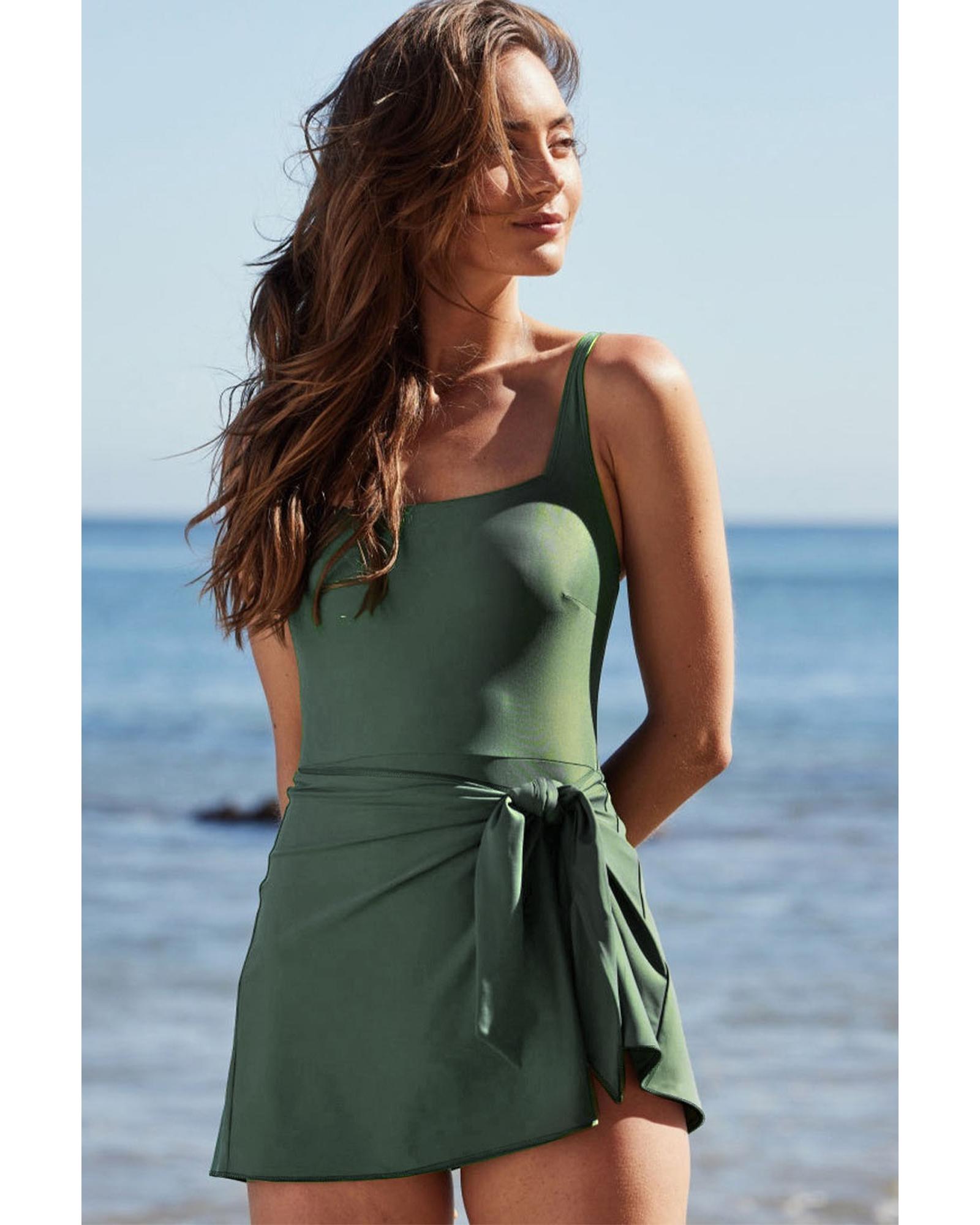 Mist Green Side Tied Waist Square Neck Adjustable Straps A-line One Piece Swim Dress – S