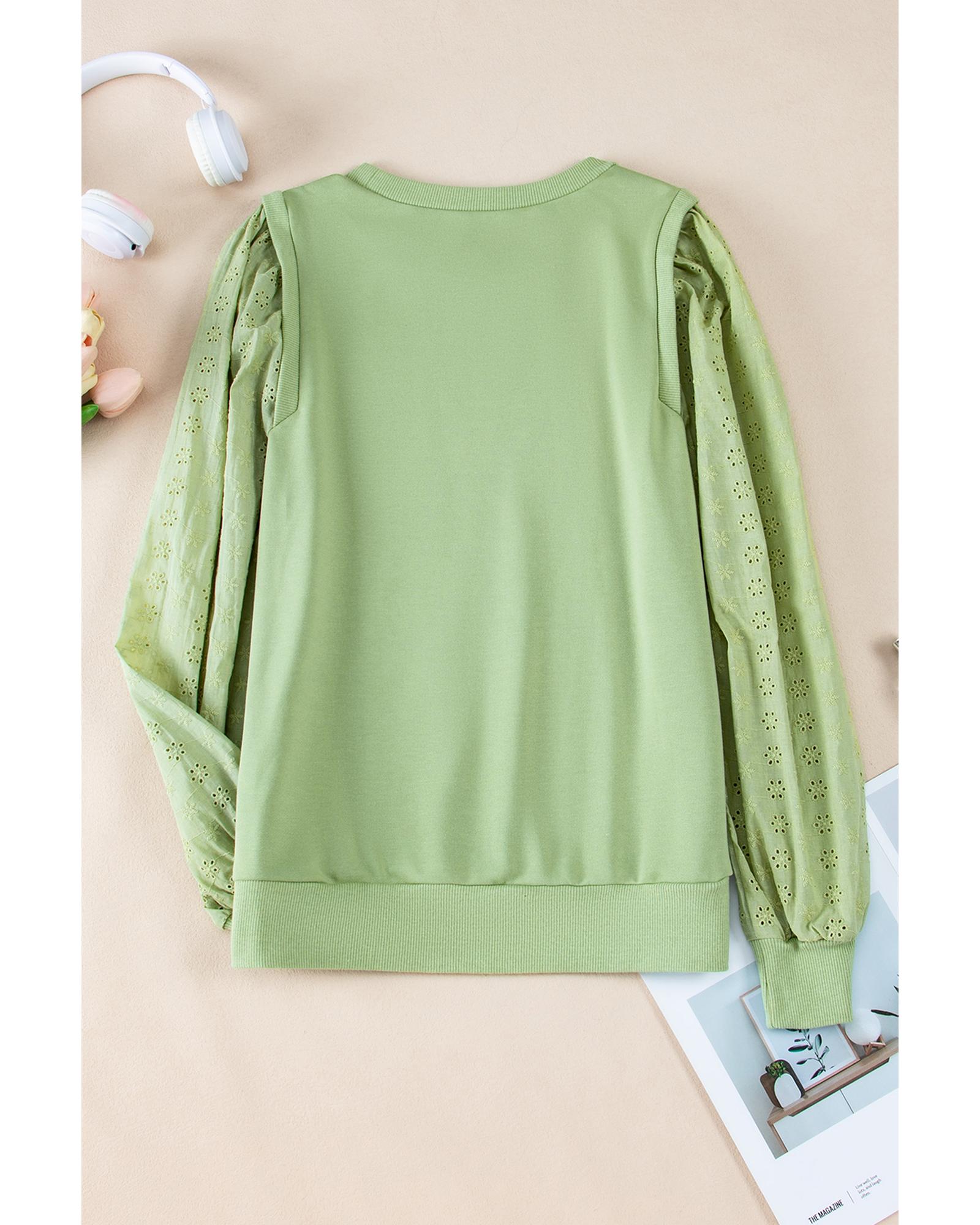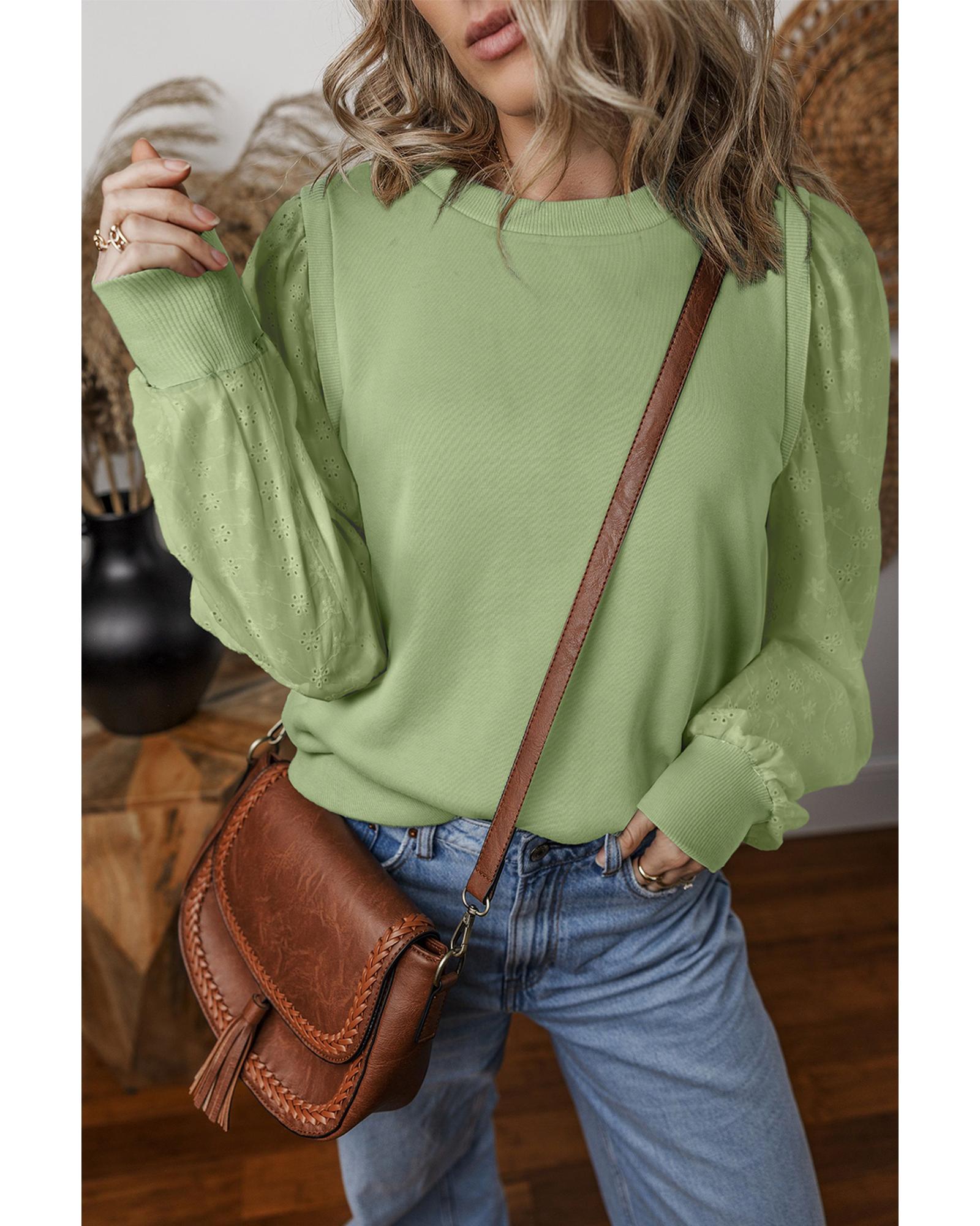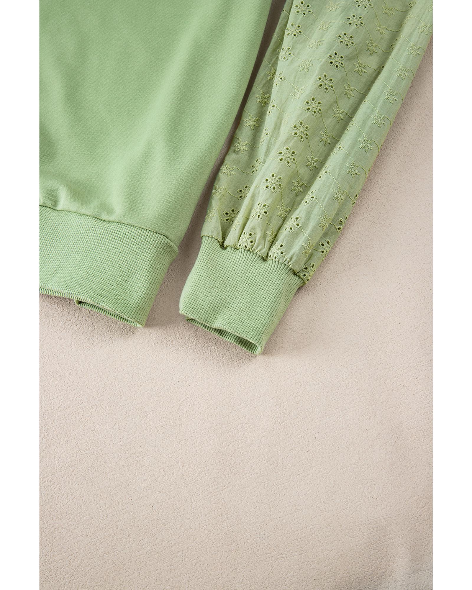 This sweatshirt features a trendy fitted design with a solid color and unique patchwork details. It is crafted with eyelet embroidered sleeves and a classic round neck, making it a versatile addition to any wardrobe. The style is designed to follow international sizing standards, and selecting one size up is recommended for the best fit.