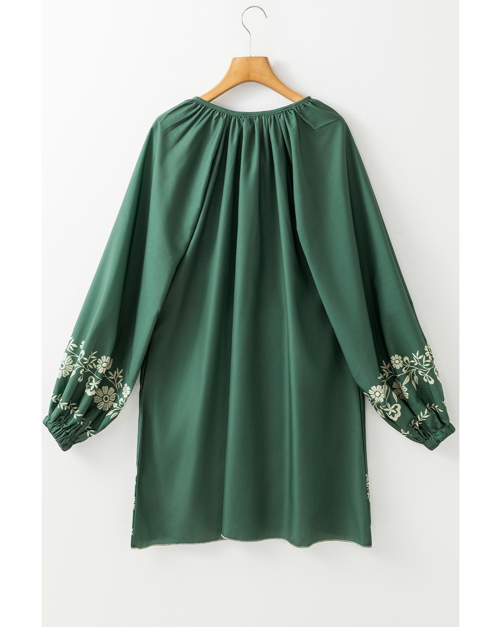 Mist Green Tie Neck Boho Floral Pattern Puff Sleeve Shift Dress – S