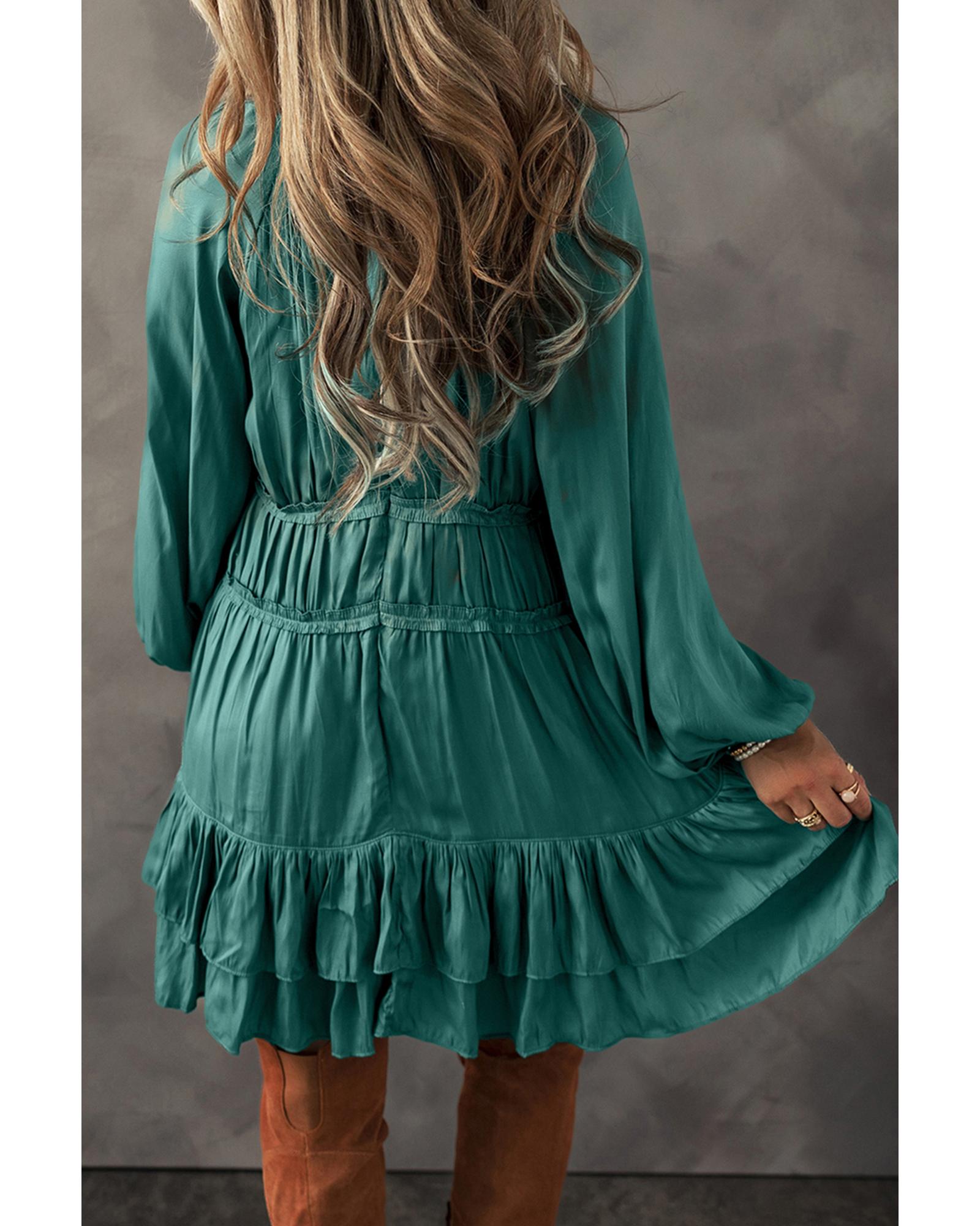 Mist Green Tiered Ruffled Puff Sleeve Loose Fit Mini Dress – L