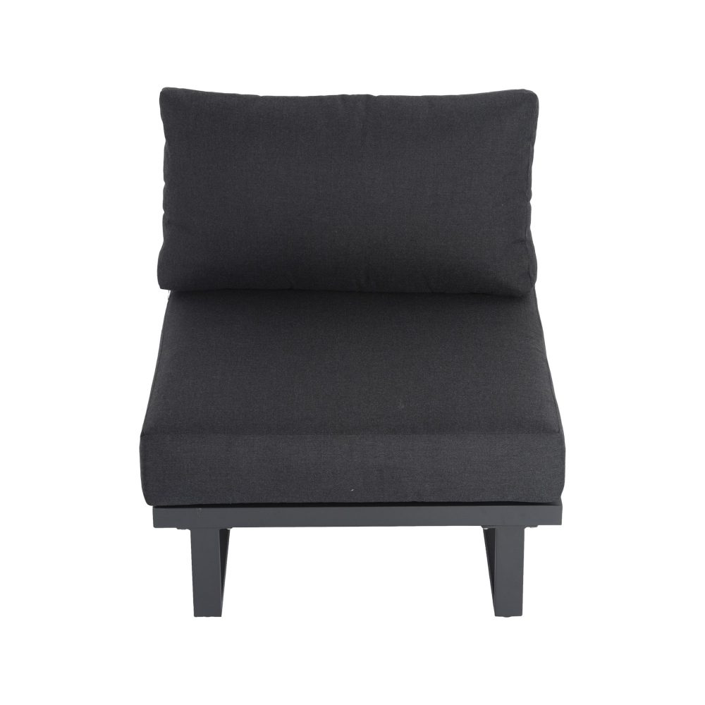 This outdoor lounge set features a modular design with slatted polywood tables, allowing for versatile configurations to suit various outdoor spaces. The modern and soft aesthetic provides a comfortable and stylish environment for relaxation and social gatherings.