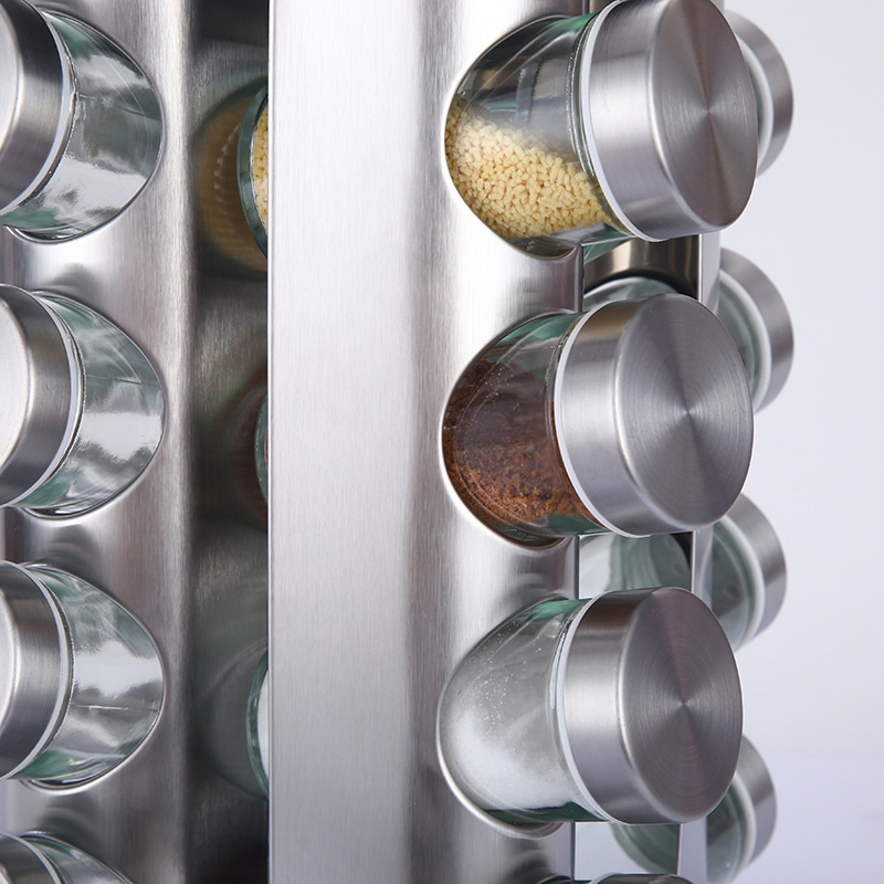 This modern stainless steel round rotating spice rack features a sleek design with a revolving base, making it a practical and stylish addition to any kitchen countertop. It provides easy access to your spices and helps keep your kitchen organized and clutter-free.