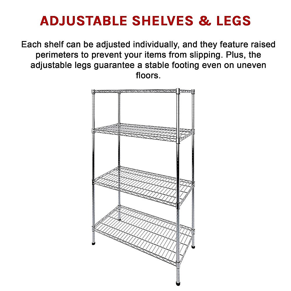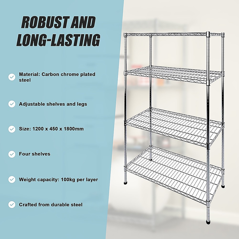 This modular wire storage shelf offers a versatile and durable solution for organizing your home or workplace. Its sleek chrome finish allows it to blend seamlessly into various environments, including offices, shops, warehouses, and living spaces. The adjustable design enables customization to fit different storage needs, whether you require a shorter unit or a longer, stretchable configuration.