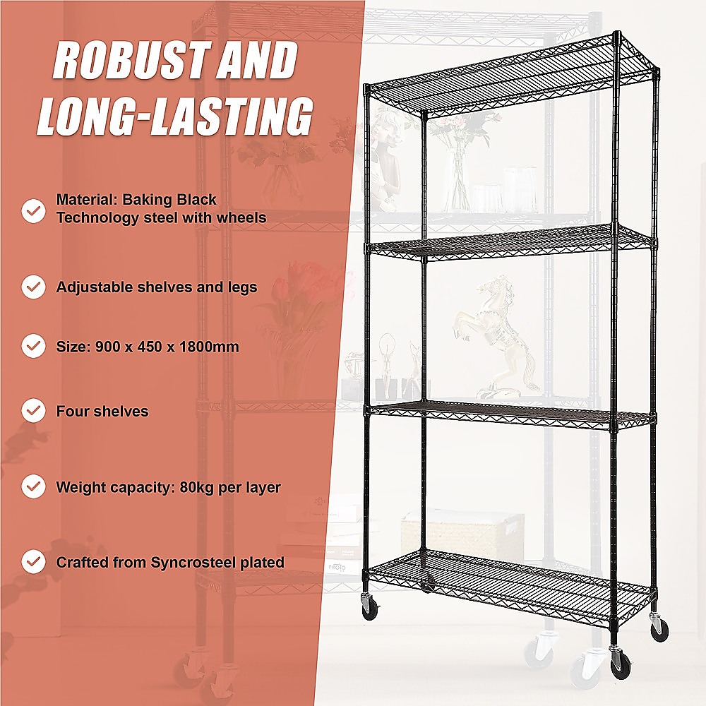 Say goodbye to your organization worries at home and work with the robust and long-lasting four-shelf storage unit. This unit excels in strength and dependability, crafted from durable steel designed to withstand the test of time. The wire shelving adds a sense of lightness and mobility, granting you unmatched versatility to adapt to your ever-changing requirements.