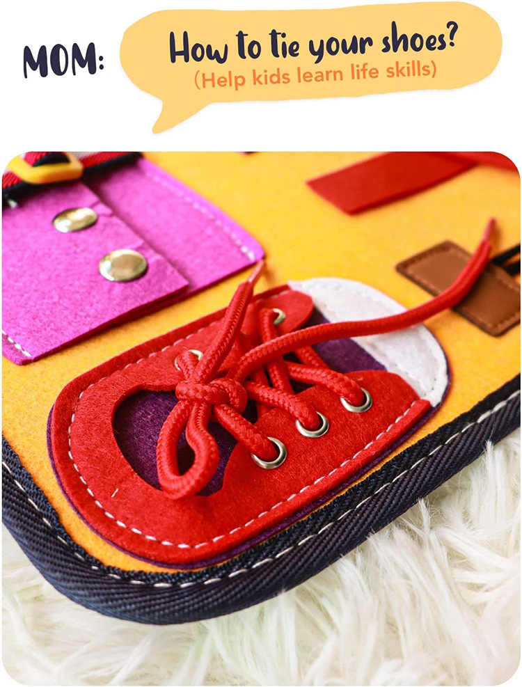 - Includes activities such as buckles, zippers, laces, and snaps for sensory engagement