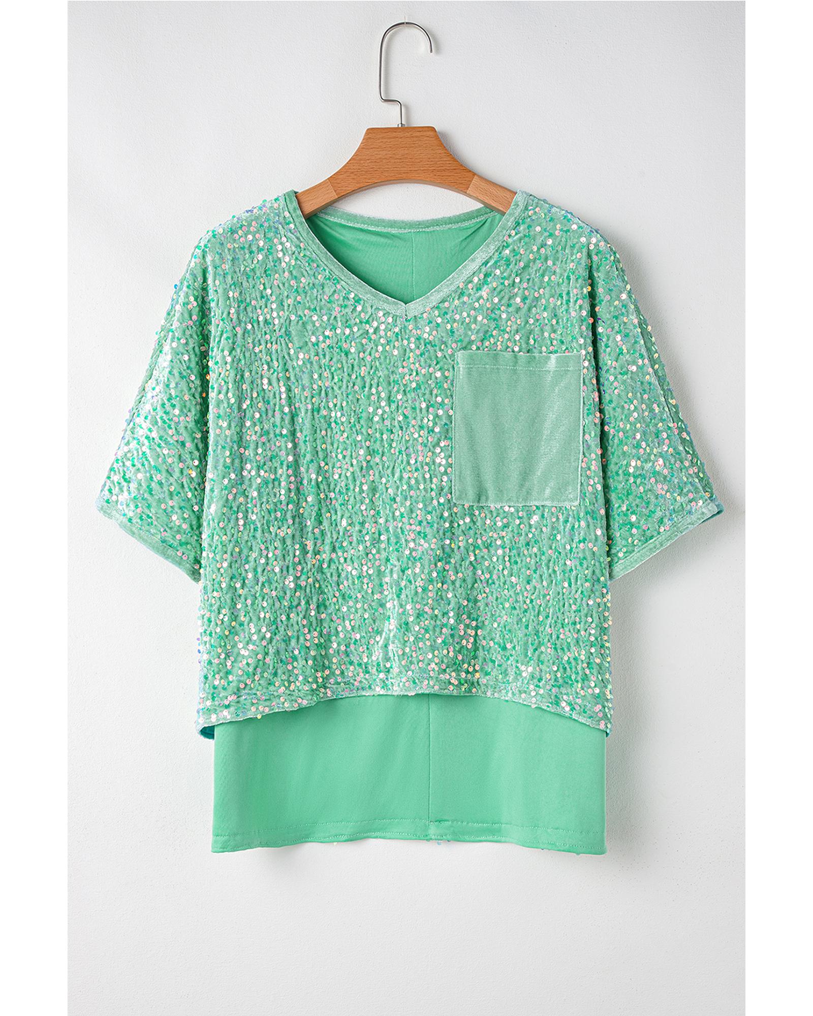 Moonlight Jade Sequin Batwing Sleeve V Neck Velvet Blouse – L