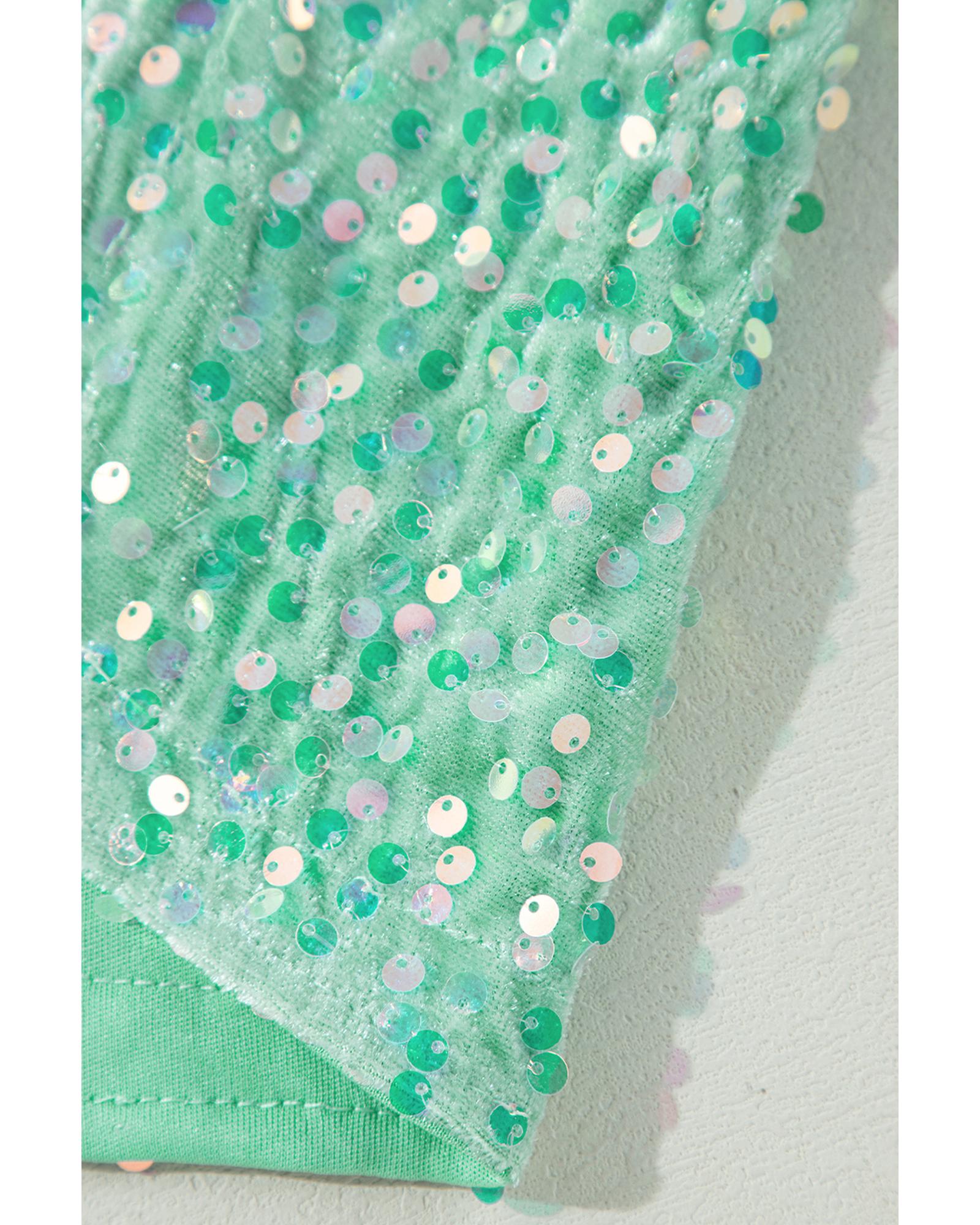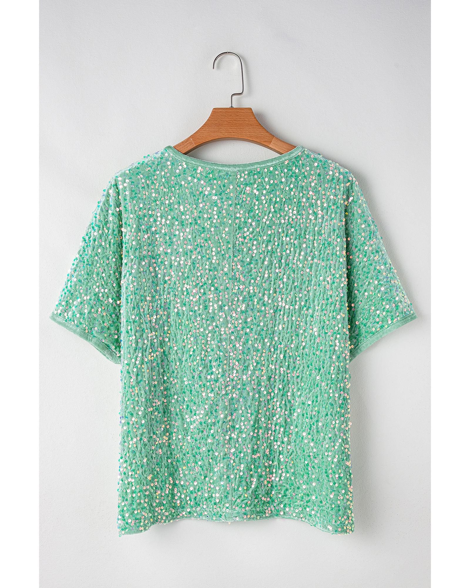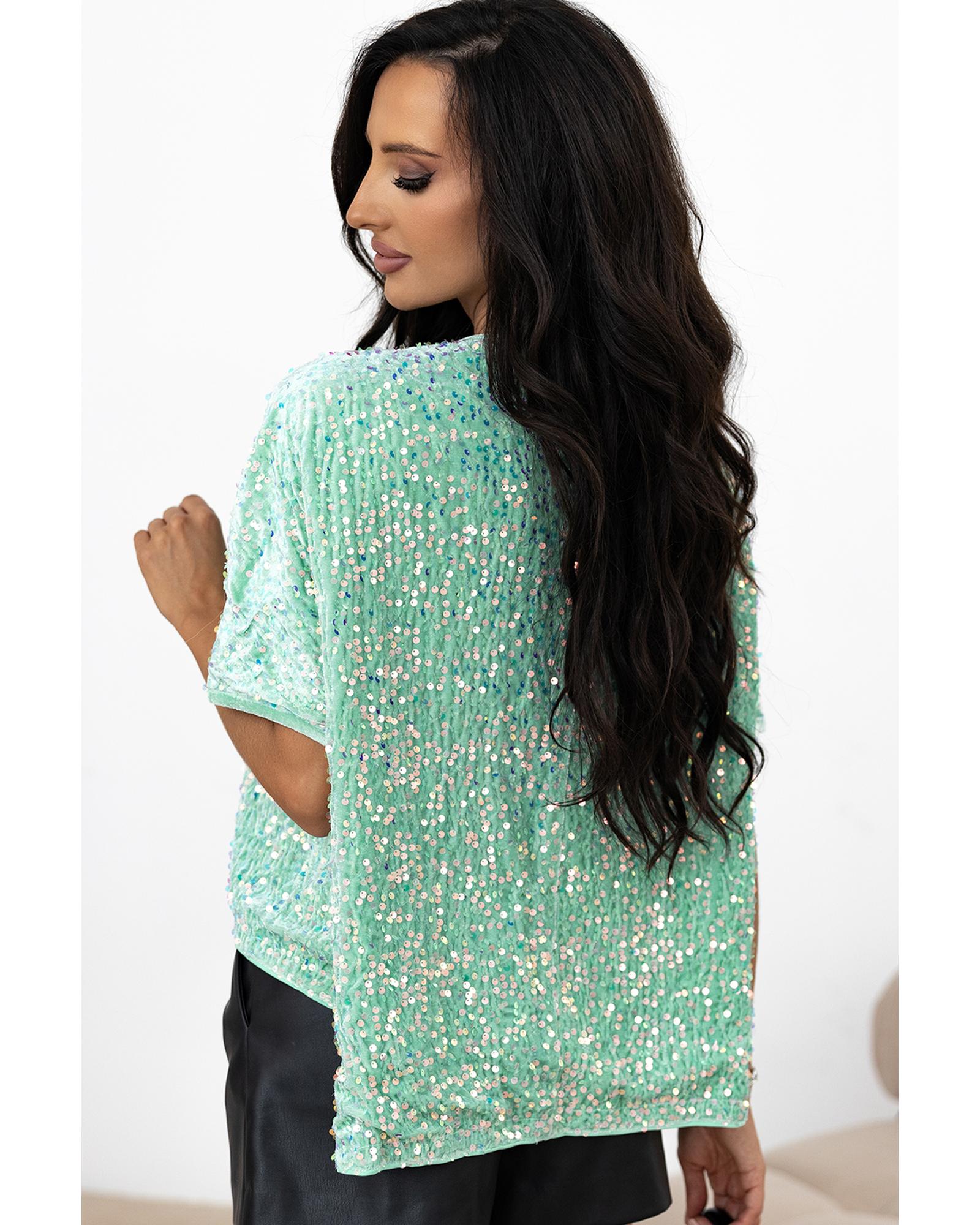 Moonlight Jade Sequin Batwing Sleeve V Neck Velvet Blouse – S