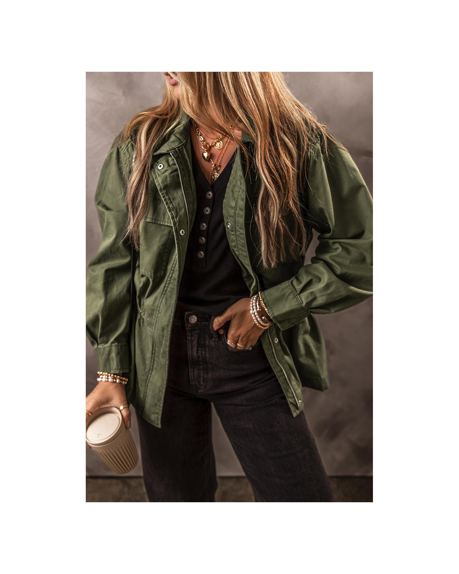 This Moss Green Snap Button Zipper Tight Waist Collared Jacket offers a stylish and trendy fitted look, suitable for various occasions. Designed with both fashion and functionality in mind, it features convenient closures and a flattering silhouette.