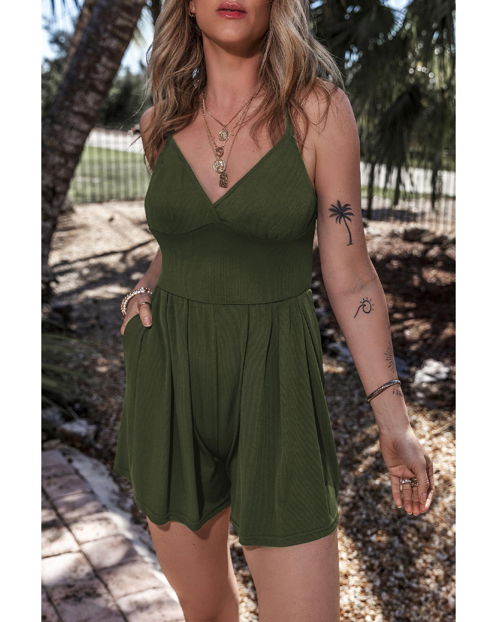 This moss green romper features a trendy fitted design with spaghetti straps and a cinched waist, creating a flattering silhouette. The ribbed fabric adds texture and style, complemented by pleated details for a chic appearance. It is a versatile piece suitable for various occasions, offering both comfort and fashion.