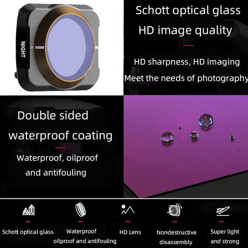 This motion camera filter is designed for use with the DJI Mavic Air 2. It features multiple layers of coating and optical glass to enhance image quality and protect the lens. The filter includes various types to suit different lighting conditions, providing effective control over light and color for clearer, more vibrant photos and videos.