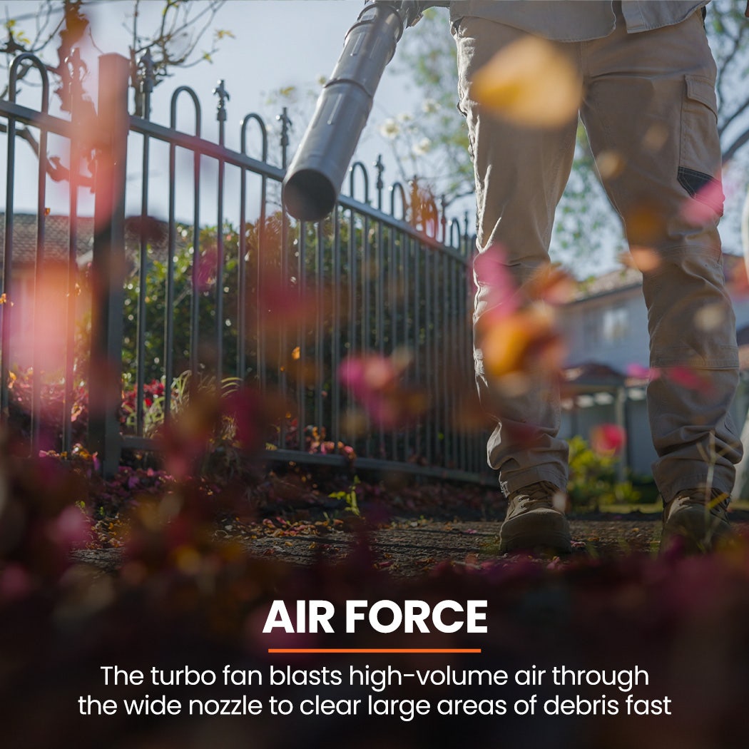 Features include a high-speed air velocity of up to 300 km/h, multiple interchangeable nozzles for versatile use, and an included gutter cleaning kit for reaching high and hard-to-access areas. The blower is suitable for various outdoor cleaning tasks, from driveways to garden beds.
