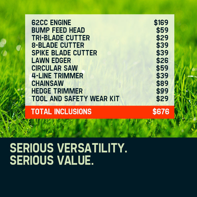- Bonus Accessory Kit (toolkit, gloves, ear muffs, shoulder strap, fuel mixer)