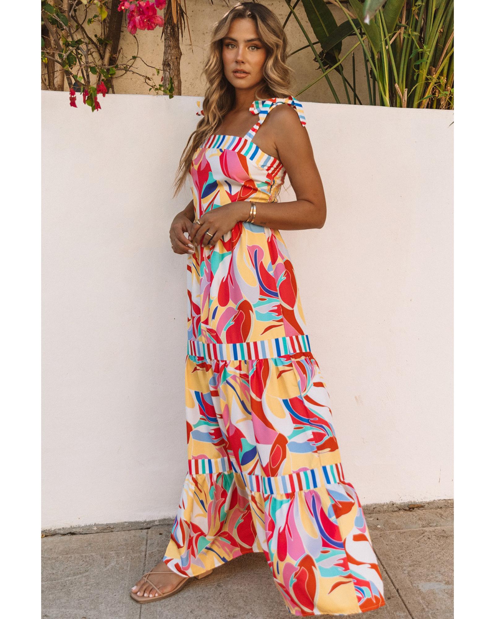 This maxi sundress features a vibrant multicolor abstract print with striped trim, offering a stylish and comfortable option for warm weather. Its lightweight fabric allows for elegant movement, making it suitable for casual outings or special occasions.