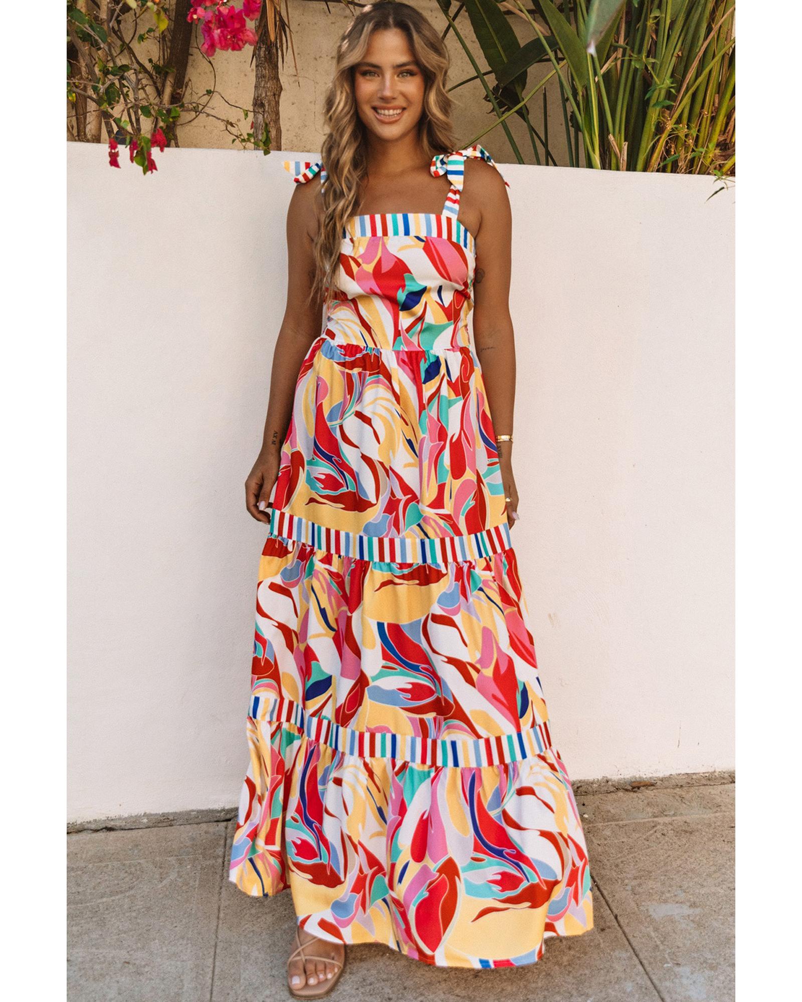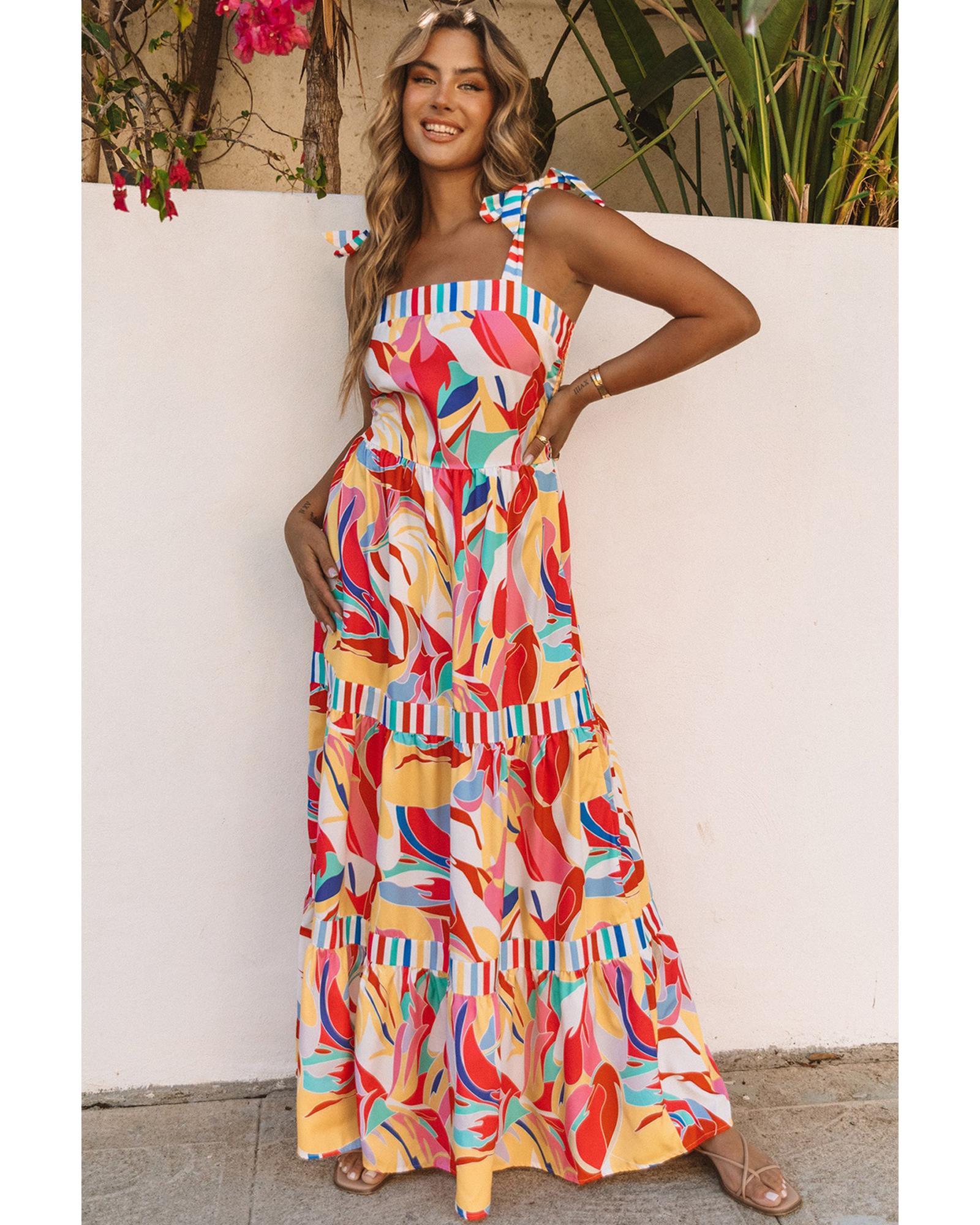 This maxi sundress features a vibrant multicolor abstract print with striped trim, offering a stylish and comfortable option for warm weather. Its lightweight fabric allows for elegant movement, making it suitable for casual outings or special occasions.