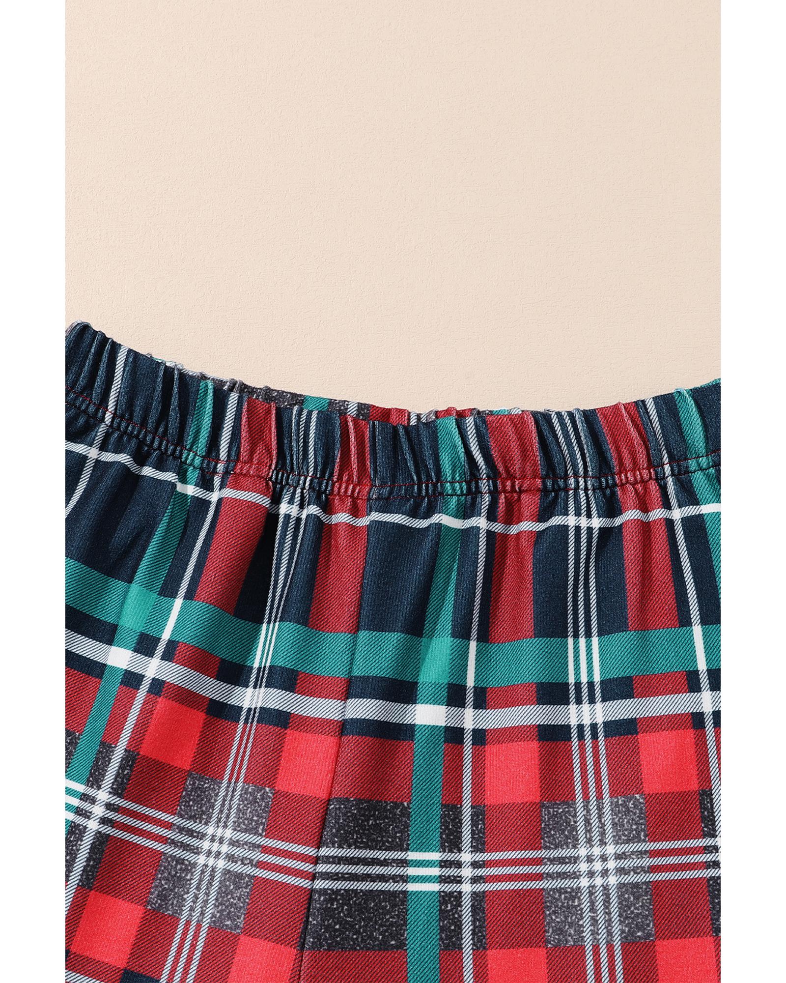 This multicolor graphic Christmas plaid pajamas set is designed for a trendy, fitted look that offers both comfort and style. Made from high-quality materials, it is suitable for lounging or holiday celebrations, featuring a festive plaid pattern with colorful graphics. The design is gender-neutral, making it versatile for anyone to wear.