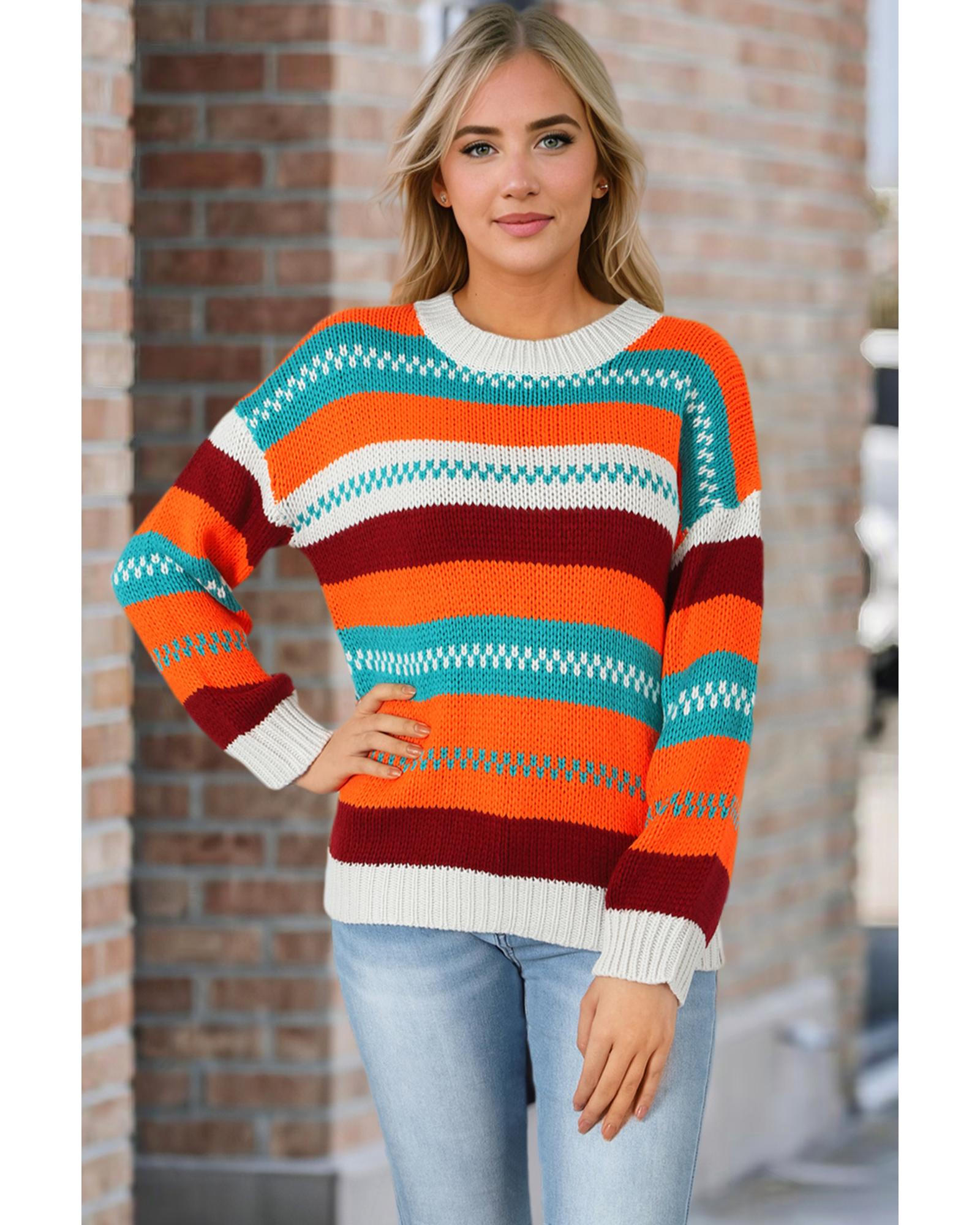This multicolor color block striped sweater features a loose fit design that offers comfort and a relaxed style. The drop shoulder detail adds a casual, trendy touch, making it suitable for everyday wear. It combines traditional and modern fashion elements, perfect for a laid-back daytime look.