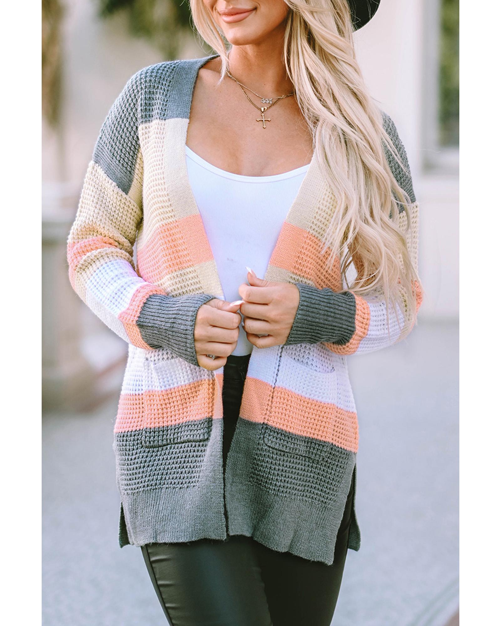 Multicolor Color Block Striped Pocketed Open Cardigan – L