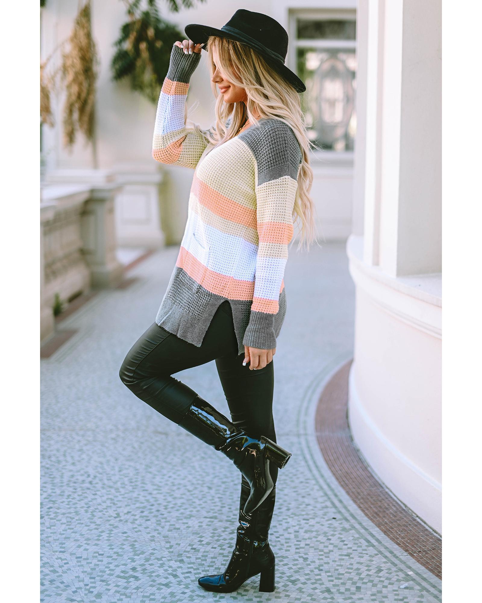 This multicolor color block striped open cardigan features a trendy design with functional pockets, making it a versatile addition to your winter wardrobe. Its fashionable style pairs well with various tops and jeans, offering a stylish and comfortable look for women.