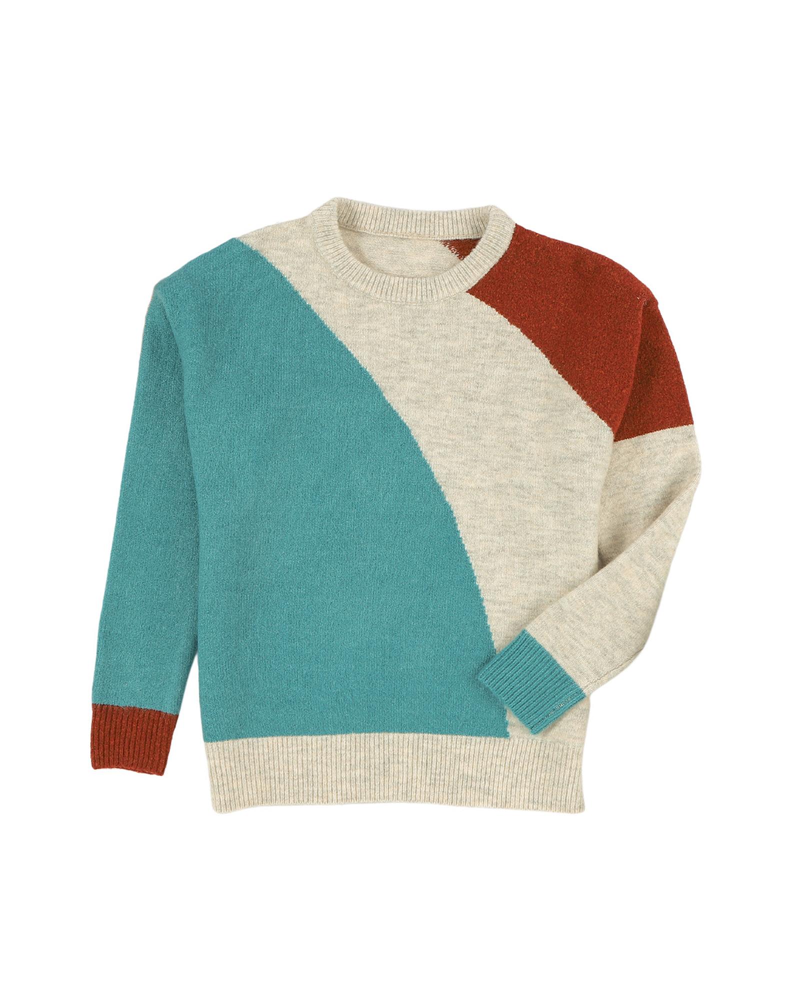 This multicolor colorblock sweater features a ribbed trim and a round neckline, offering a stylish and comfortable fit. Its loose silhouette and dropped sleeves provide a relaxed look, making it an essential piece for fall and winter wardrobes.