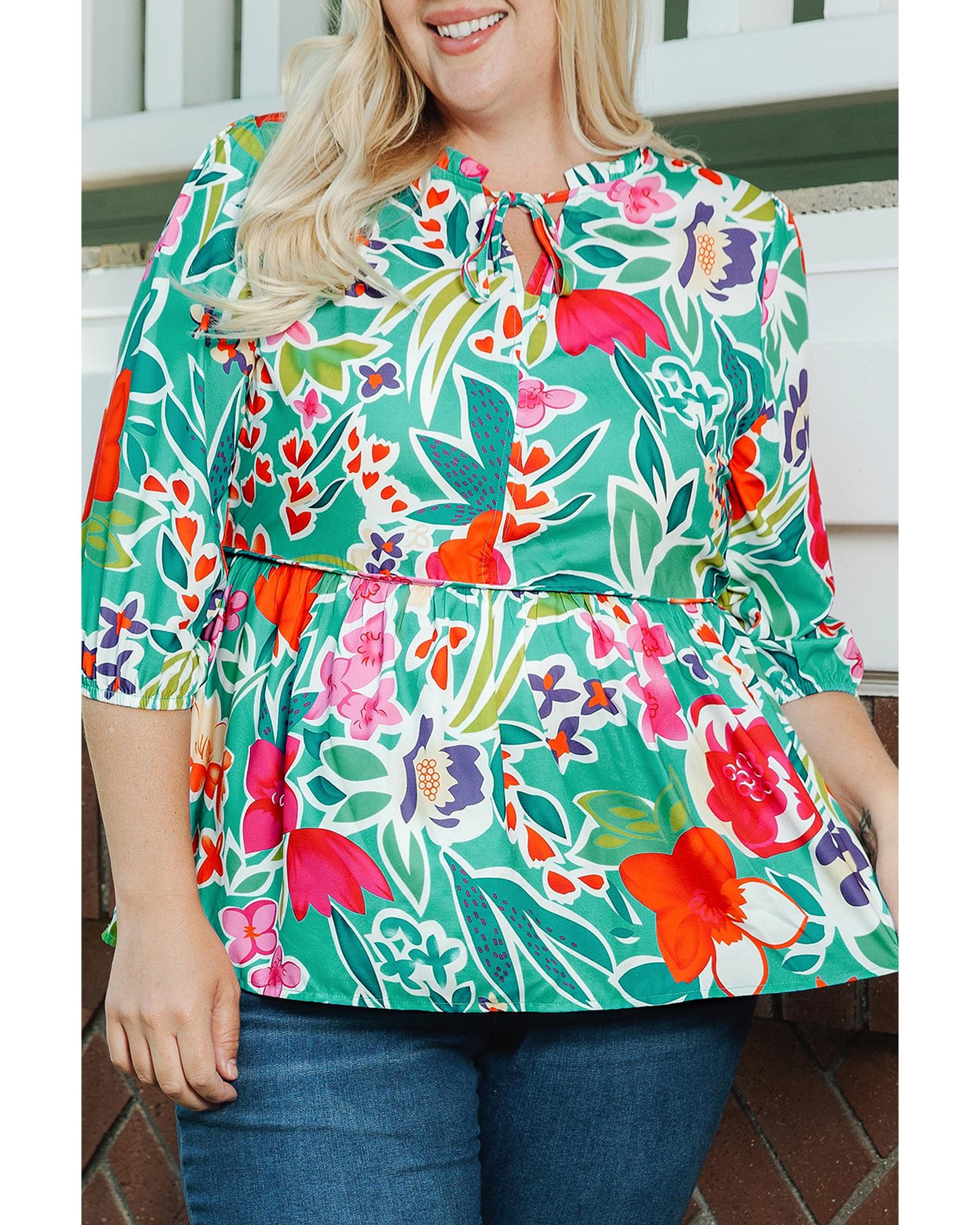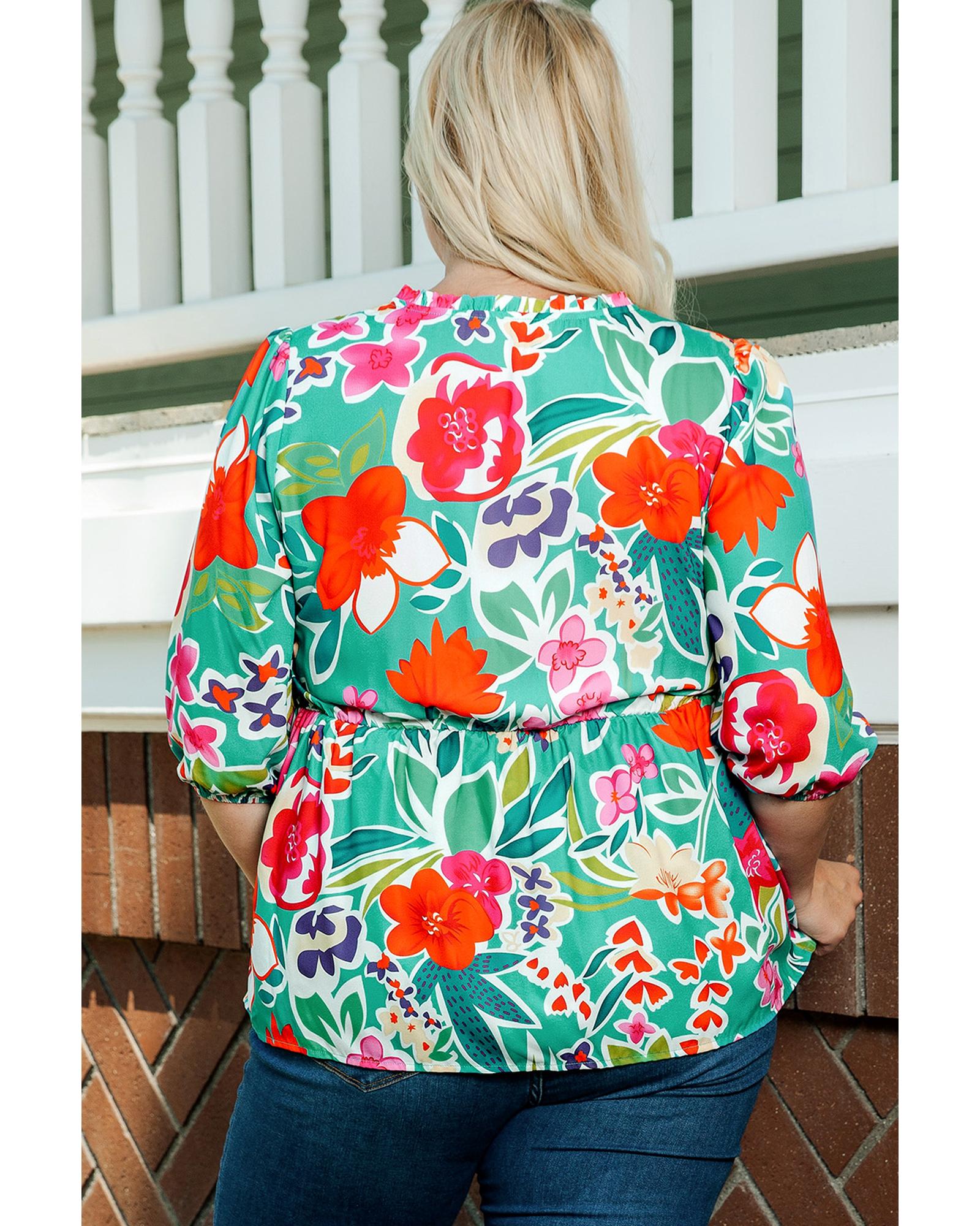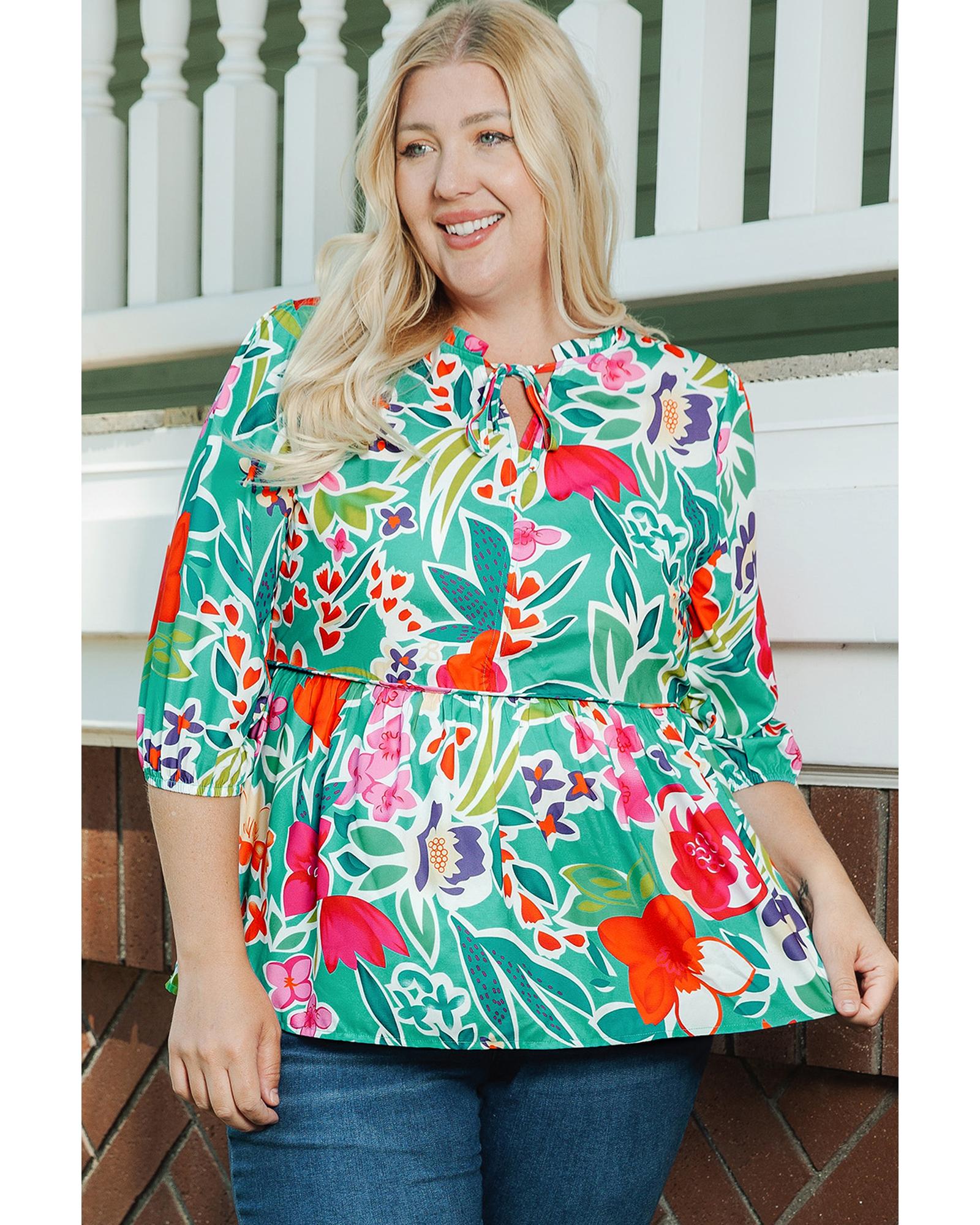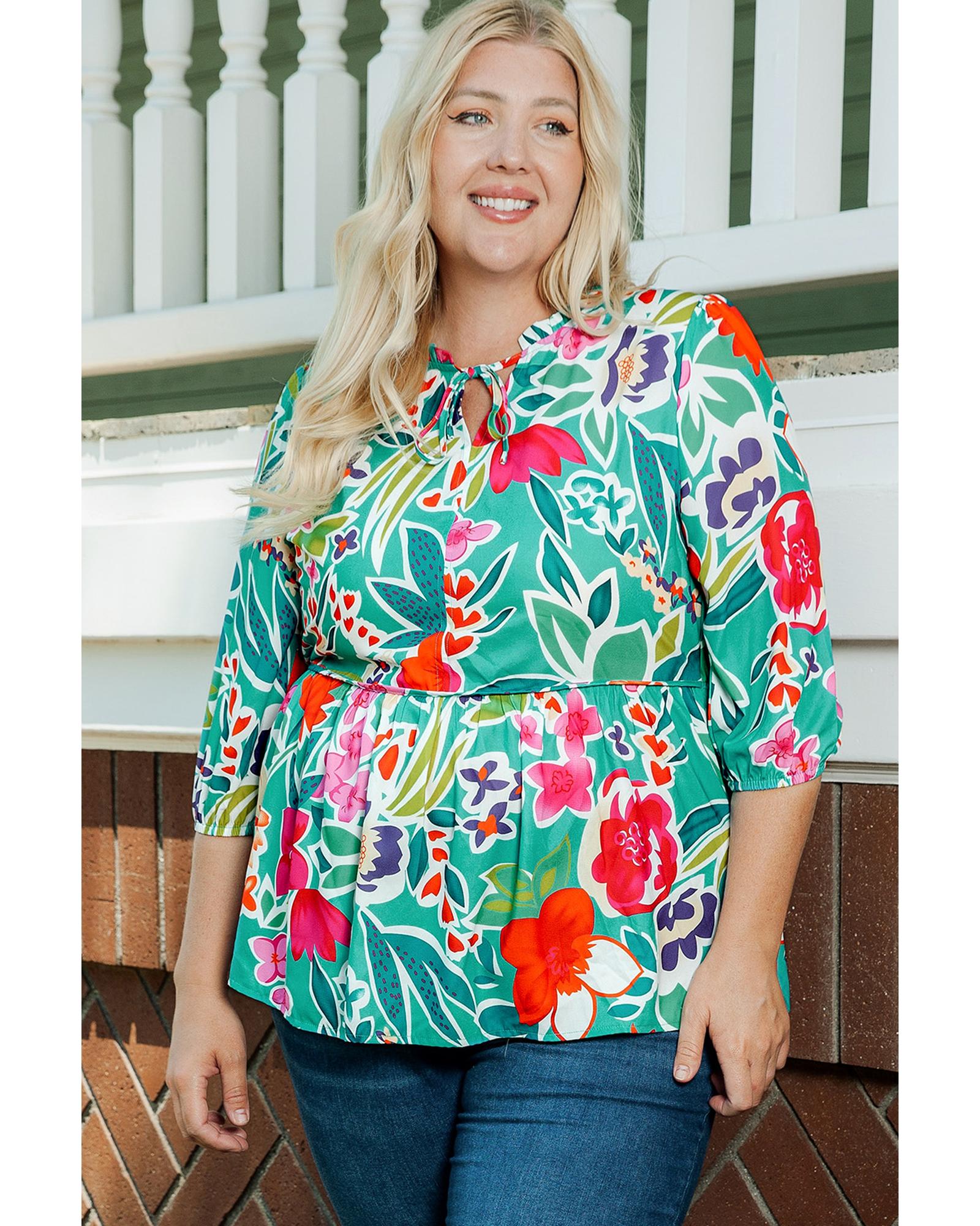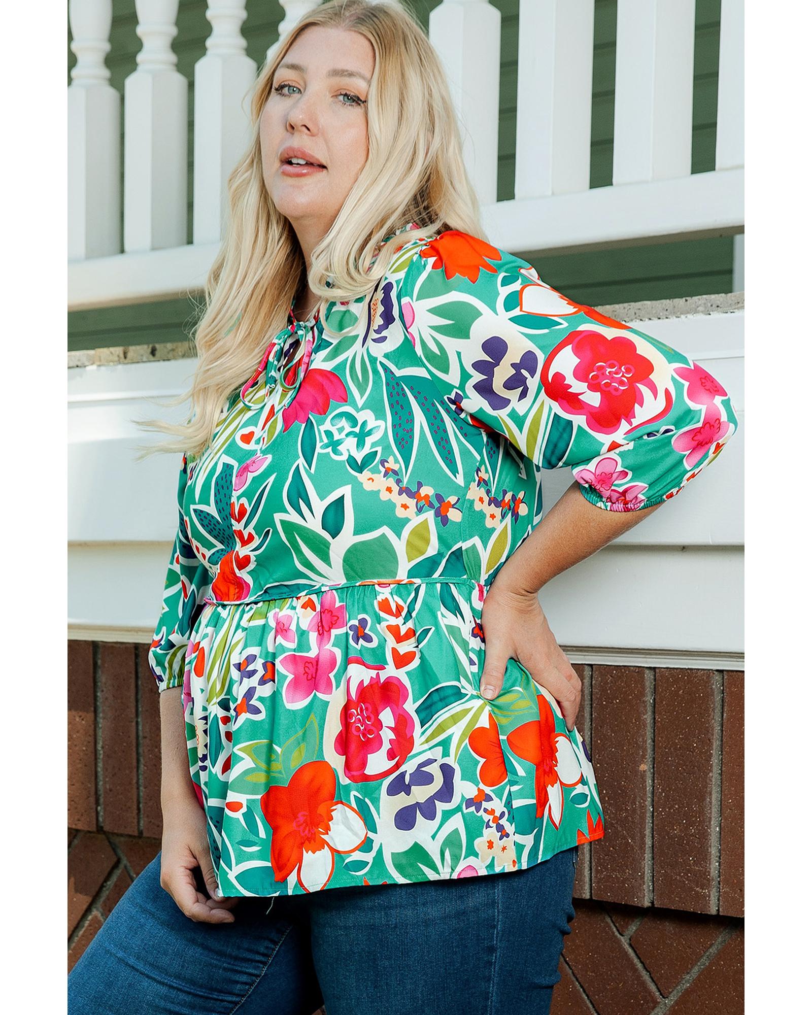 This stylish blouse features a vibrant multicolor floral print and a flattering peplum silhouette, designed for a trendy fitted look. It offers a comfortable fit with soft fabric and fashionable details such as a split neckline with a self-tie and 3/4 length puff sleeves. Ideal for plus size wearers, this blouse combines elegance and comfort for various occasions.