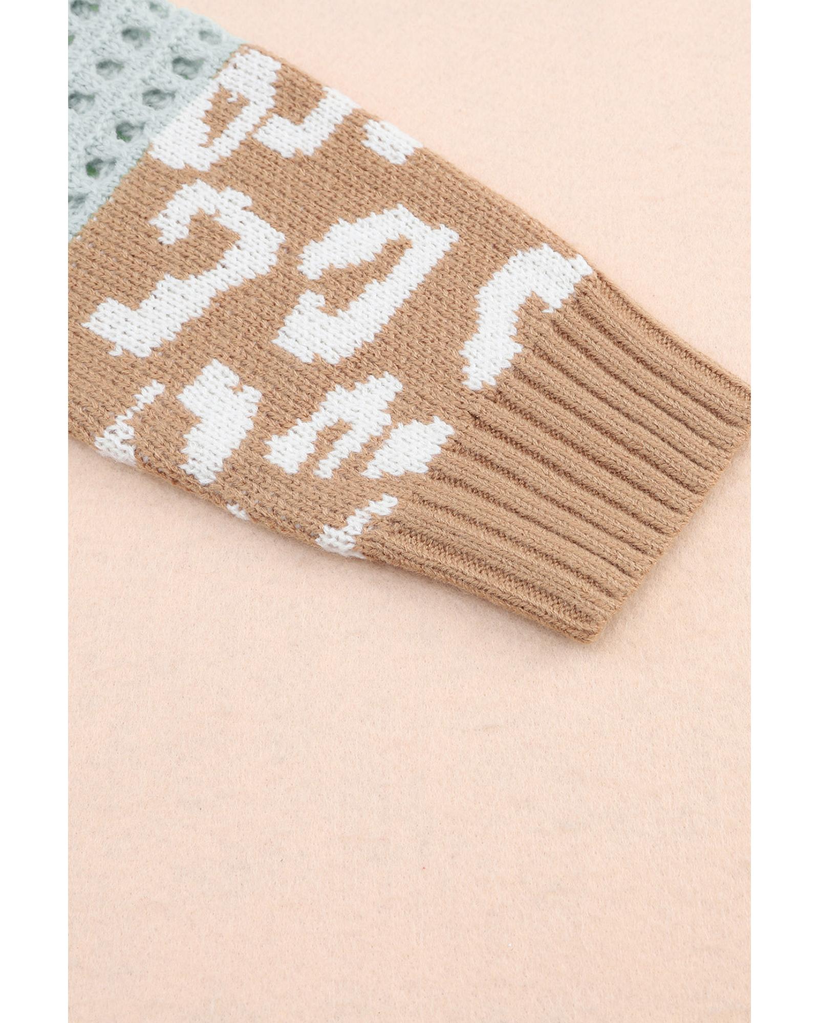 This multicolor leopard and striped mix pattern knit sweater offers a trendy and comfortable fit, suitable for various casual occasions. Crafted from soft crochet knit fabric, it combines style with comfort through its relaxed fit and high elasticity. The wide rounded neckline and long sleeves add to its versatile design, making it a fashionable choice for everyday wear.