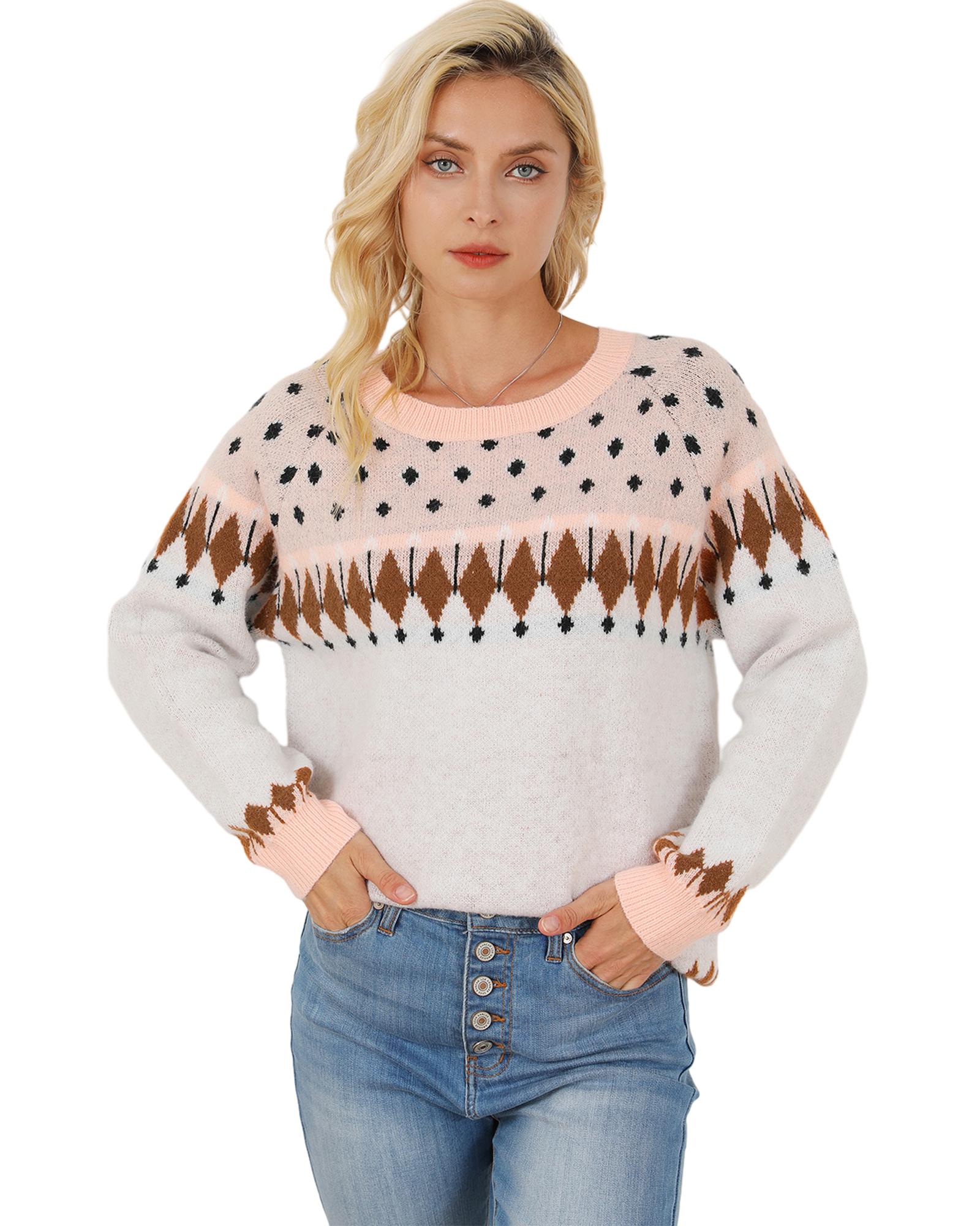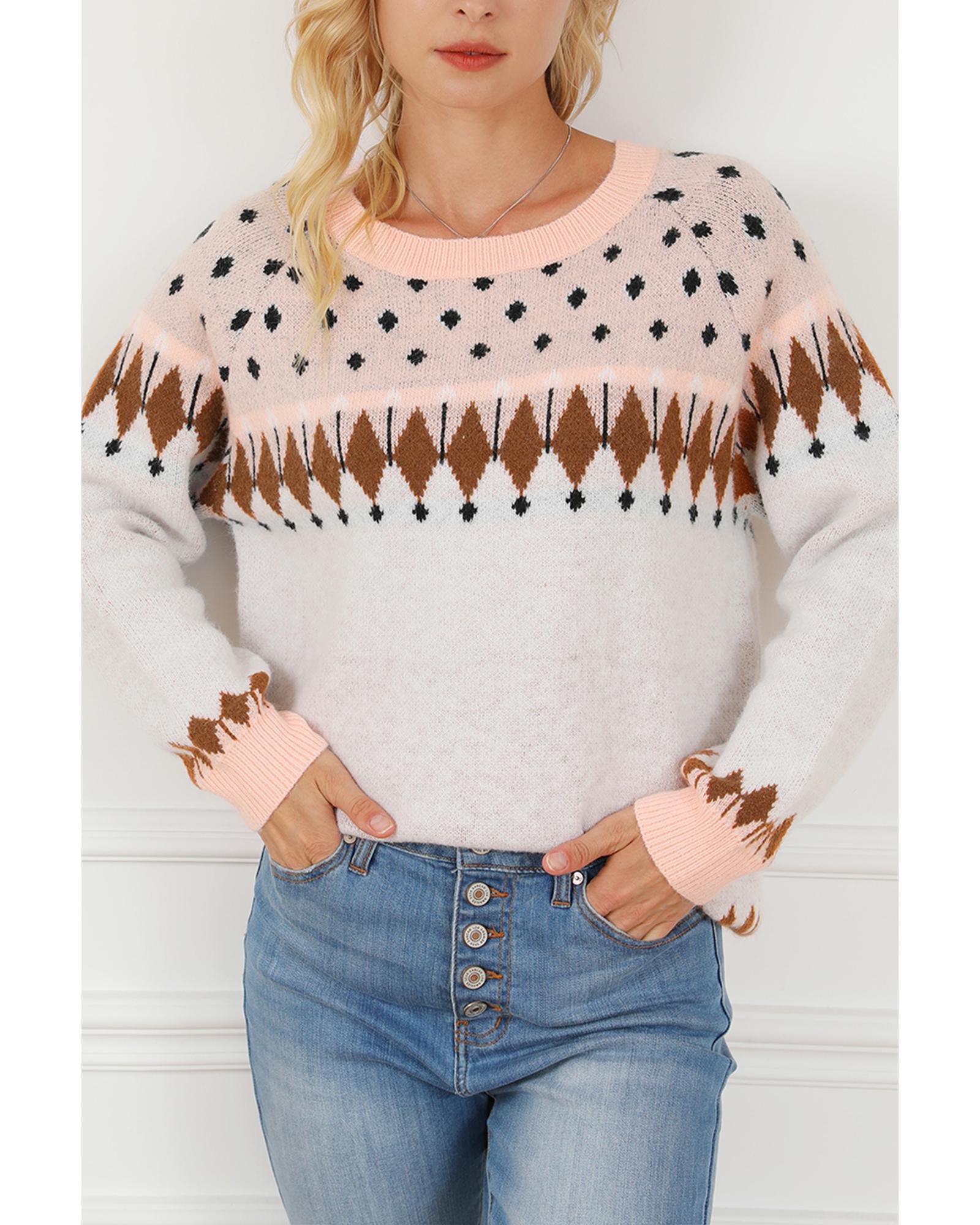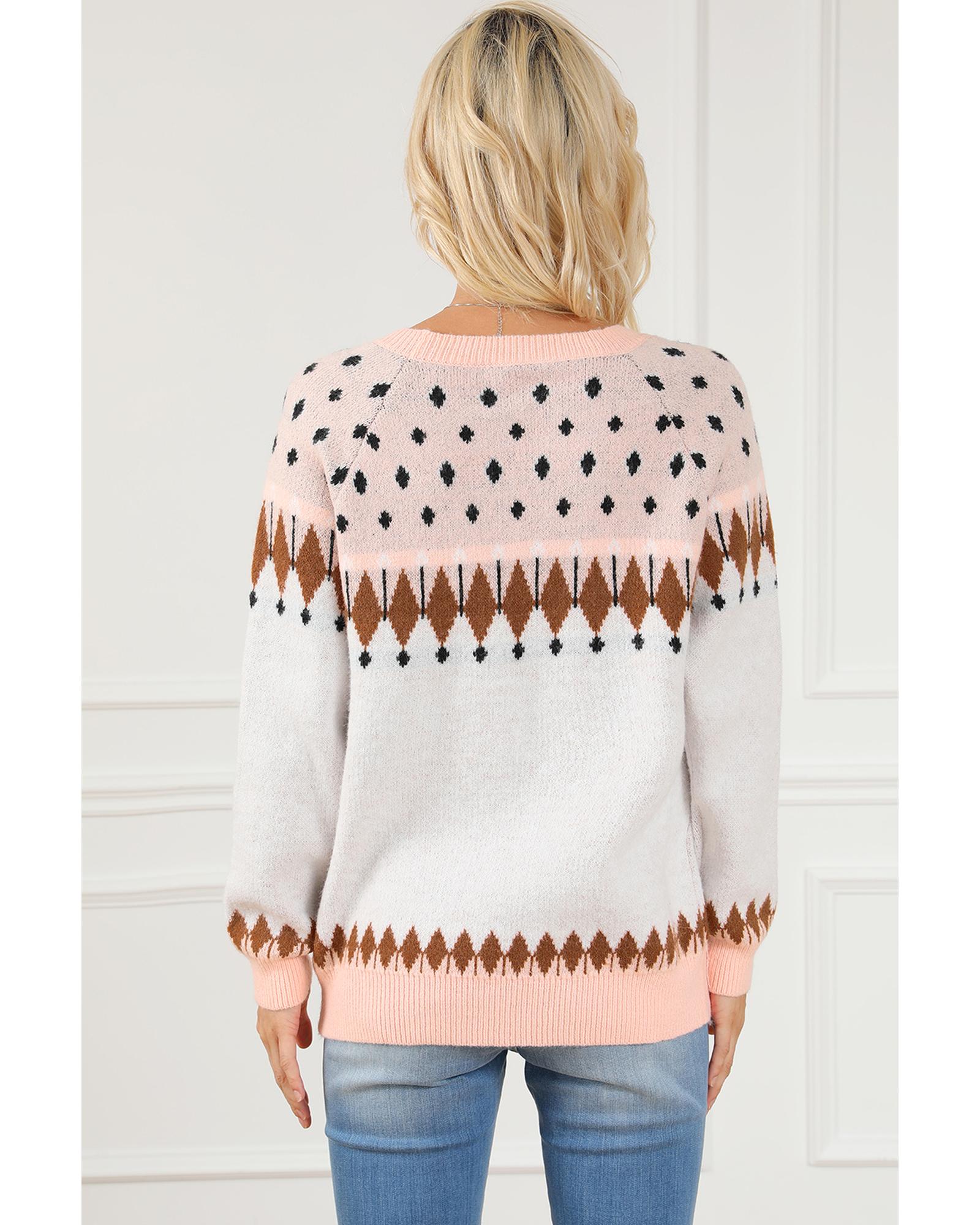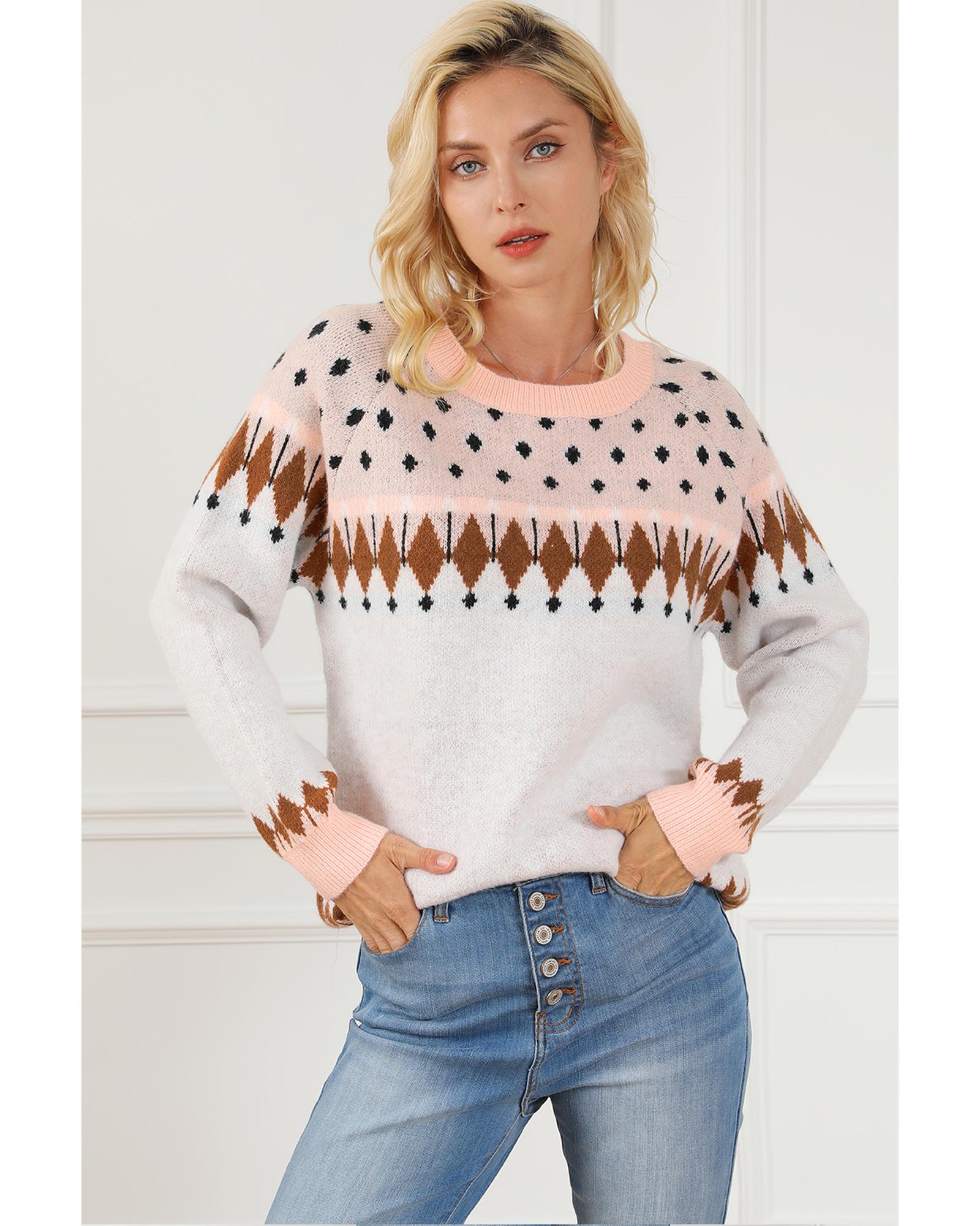 This multicolor mixed geometric detail raglan sleeve sweater features a trendy fitted design suitable for various styles. Crafted with soft and comfortable fabric, it offers both style and comfort for everyday wear.