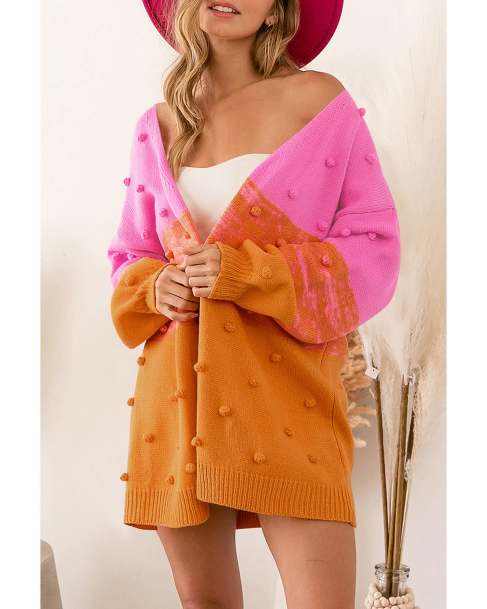 This multicolor pompom color block open front cardigan offers a trendy and stylish look, perfect for layering and making a fashion statement. Its vibrant design and cozy knit make it an ideal addition to your wardrobe for various occasions.