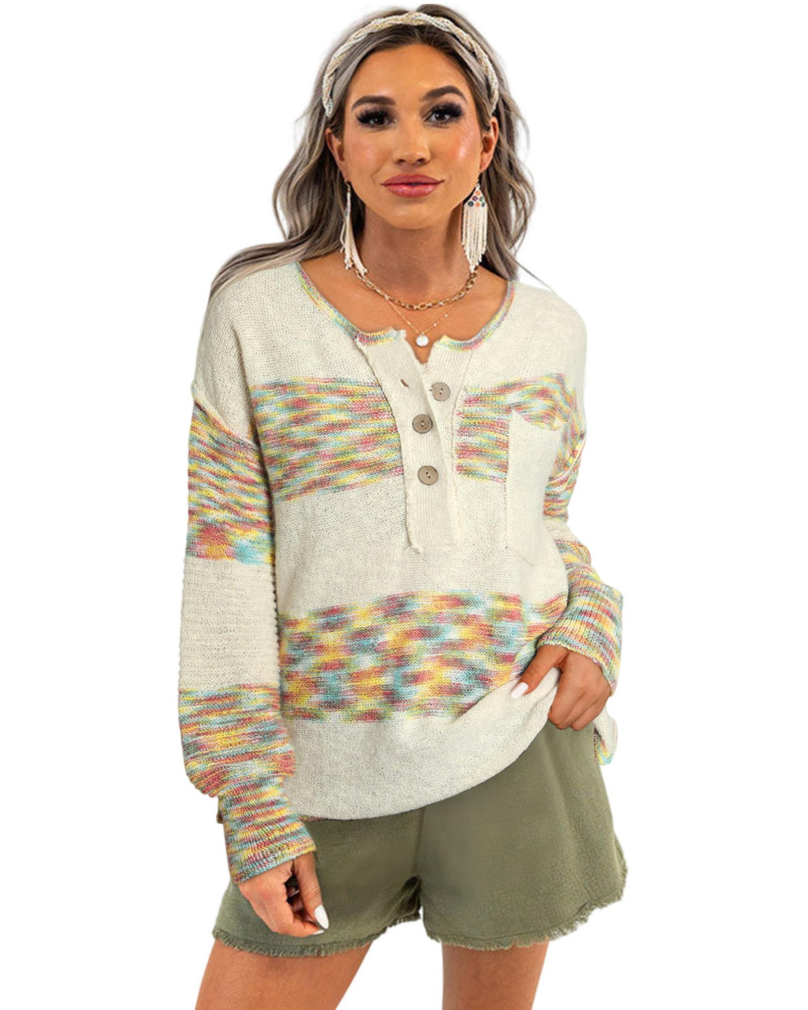 This multicolor space dye Henley knit sweater combines casual style with trendy design elements. It features a fitted silhouette with fashionable details, making it suitable for everyday wear and casual outings.