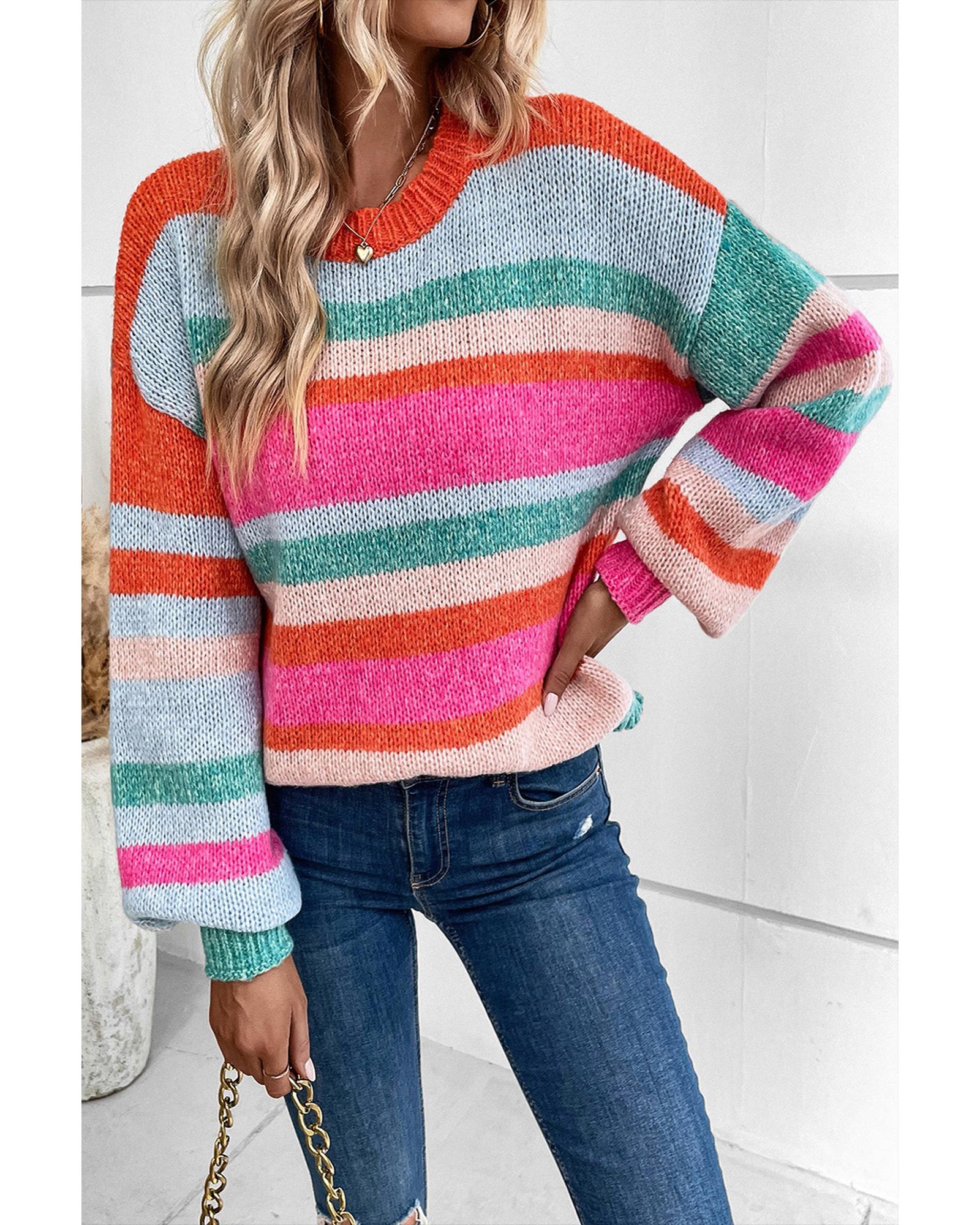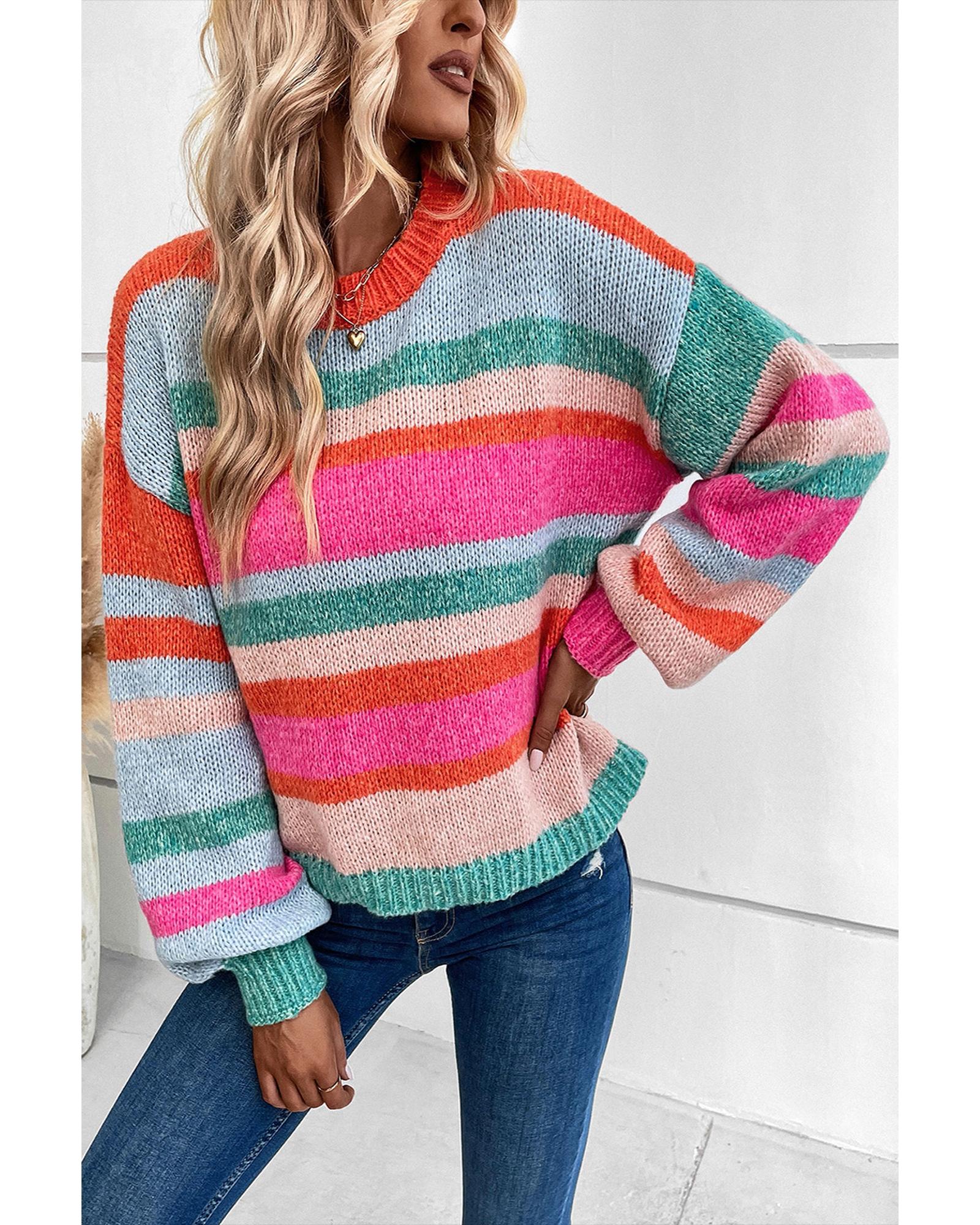 This multicolor striped knit sweater features a trendy design with a relaxed fit, making it a versatile addition to any wardrobe. The drop shoulder and puff sleeves add a feminine touch, while the soft knit fabric ensures comfort for everyday wear.