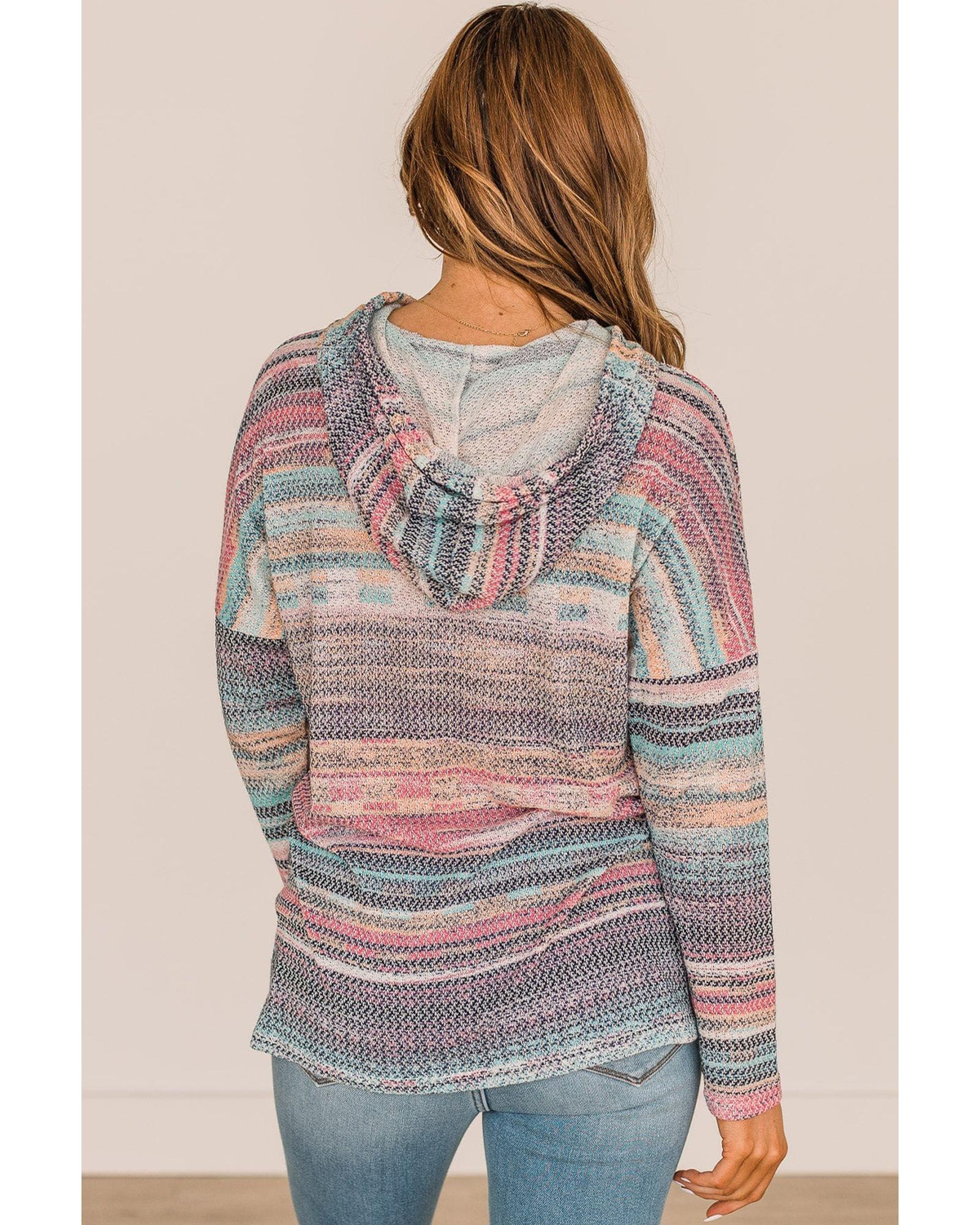 This multicolor striped print cable knit hoodie features a trendy fitted design with a drop shoulder style. Made from high-quality materials, it offers both comfort and versatility, making it easy to pair with various outfits. Suitable for women, this hoodie combines stylish elements with a relaxed fit for everyday wear.