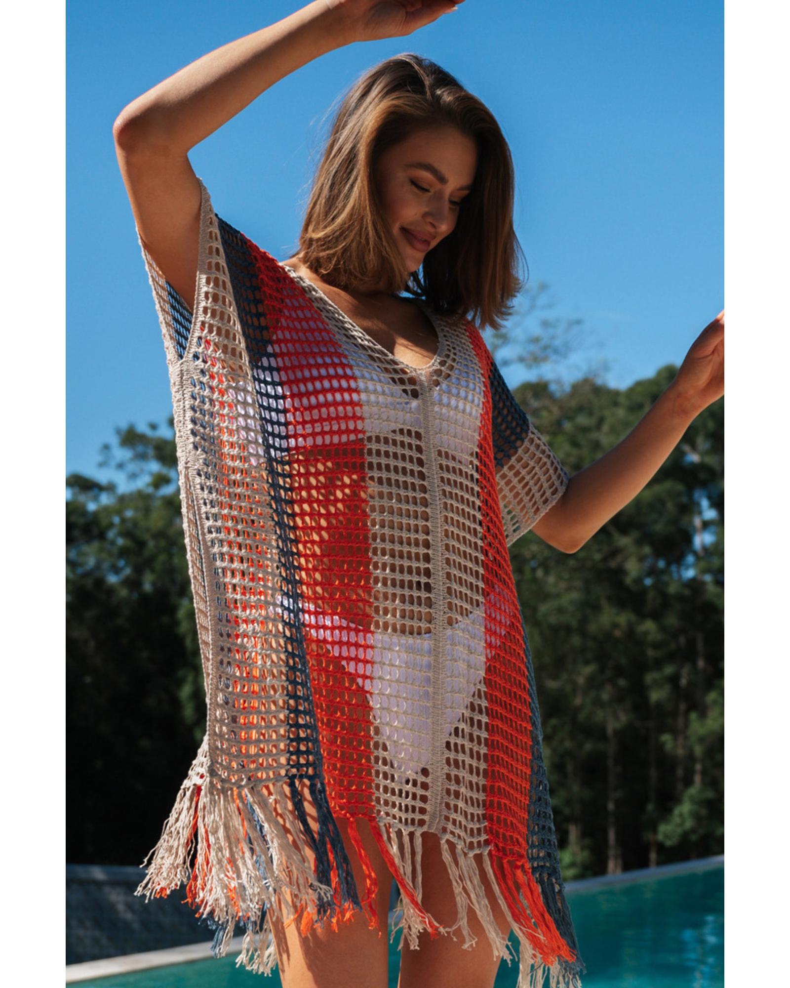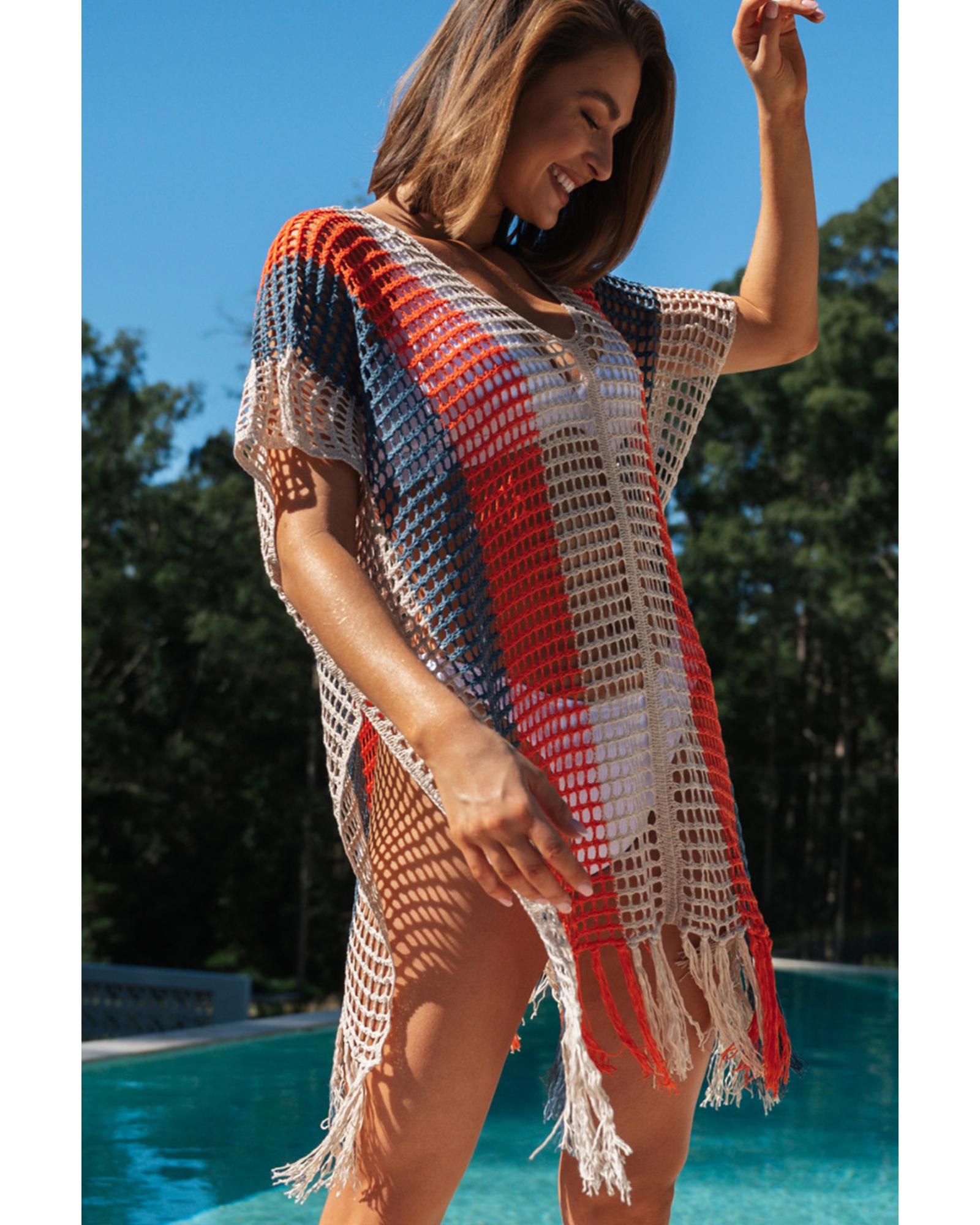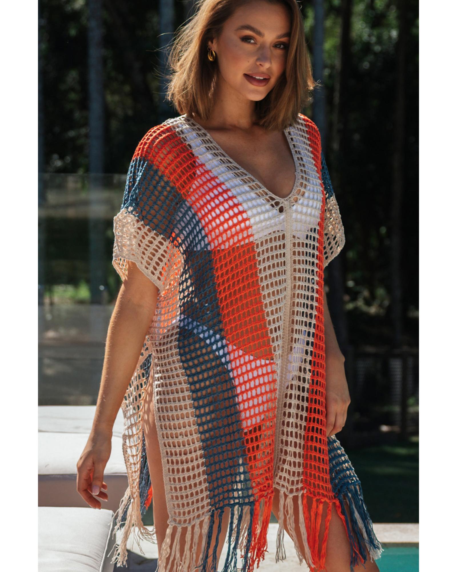 This multicolor striped tassel crochet V-neck beach cover-up is designed with a trendy fitted look, making it perfect for beach parties or vacations. It features playful tassels, hollow crochet details, and a loose fit for comfort and style. The lightweight fabric ensures easy packing and wearability, while the striped pattern adds visual interest and a slimming effect.