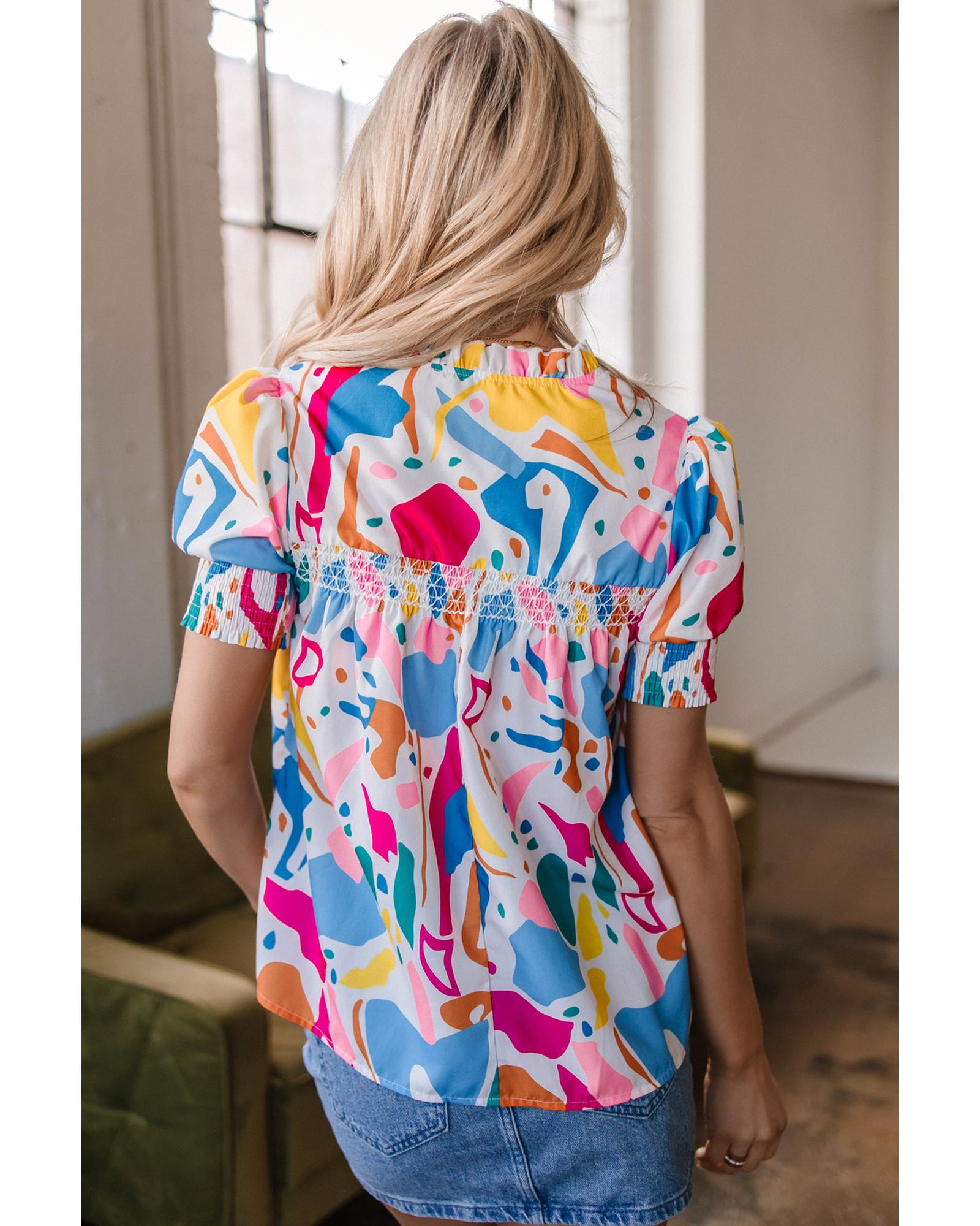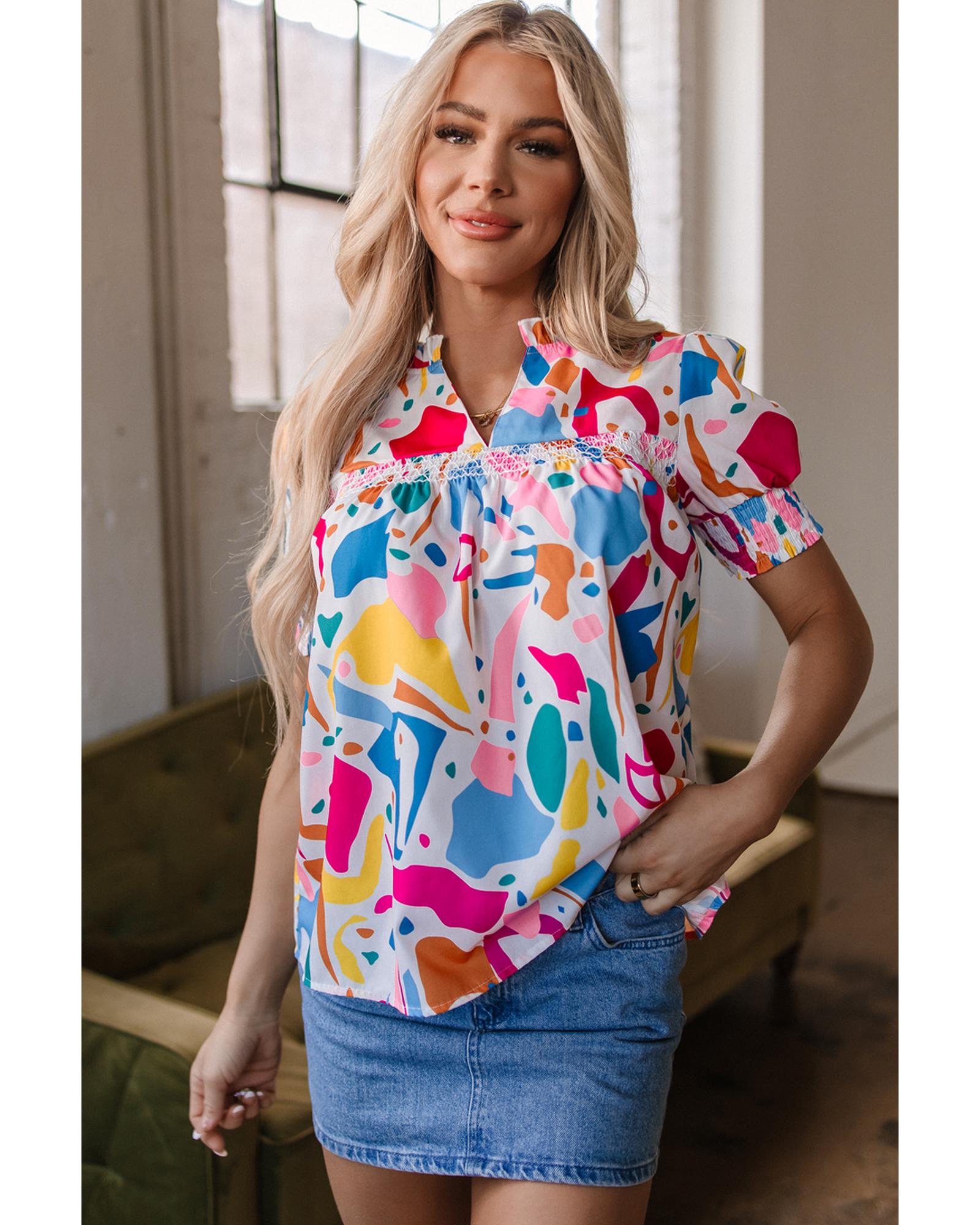 This blouse features a multicolour abstract print combined with delicate lace details, creating a stylish and elegant appearance. The shirred short sleeves provide a comfortable fit, while the split neck design adds a flattering touch to the overall look.
