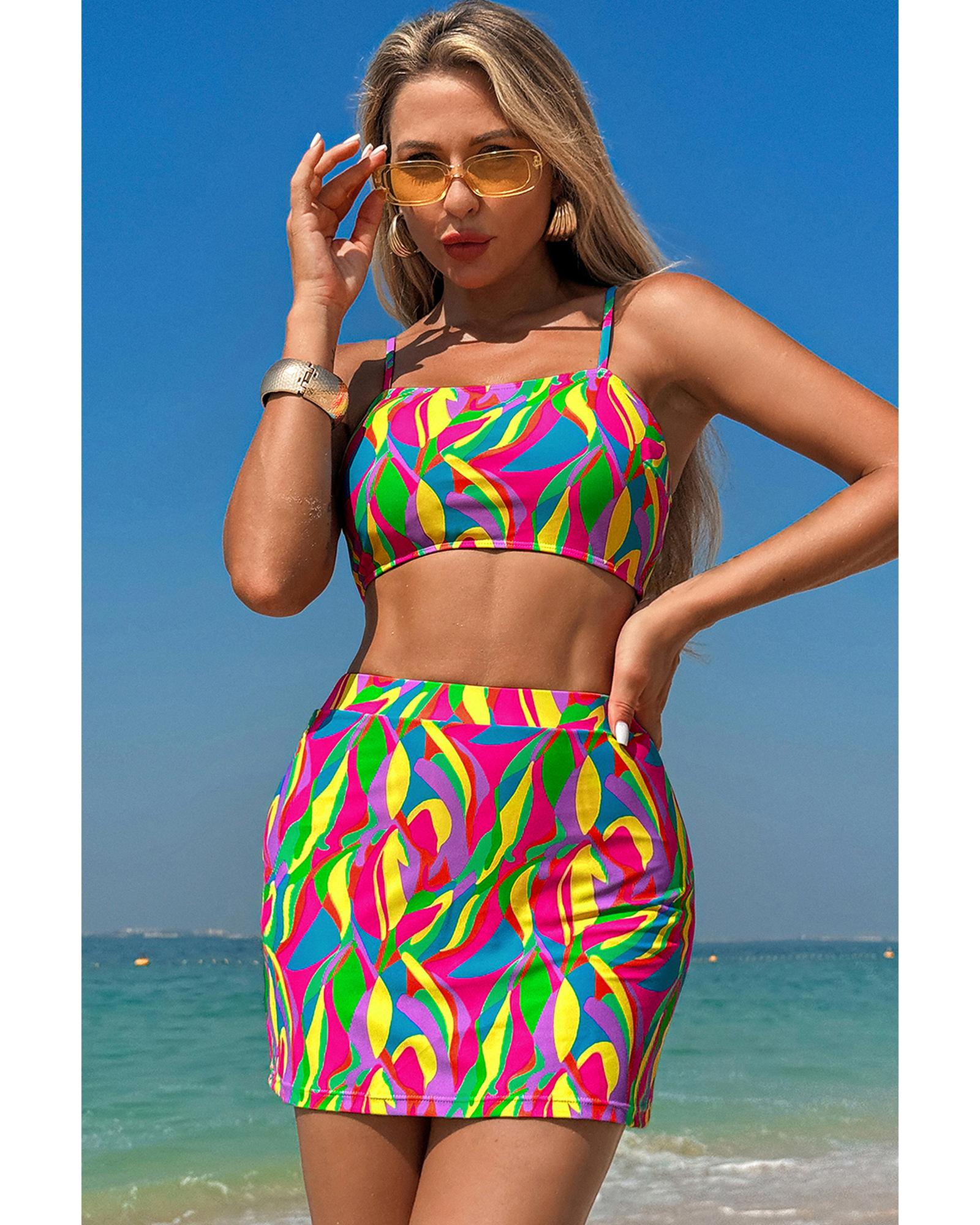 This multicolour abstract print bikini set features a textured fabric design and a high waist cut, combining artistic style with comfort. The spaghetti straps add a delicate touch, making it suitable for stylish beachwear or poolside lounging.
