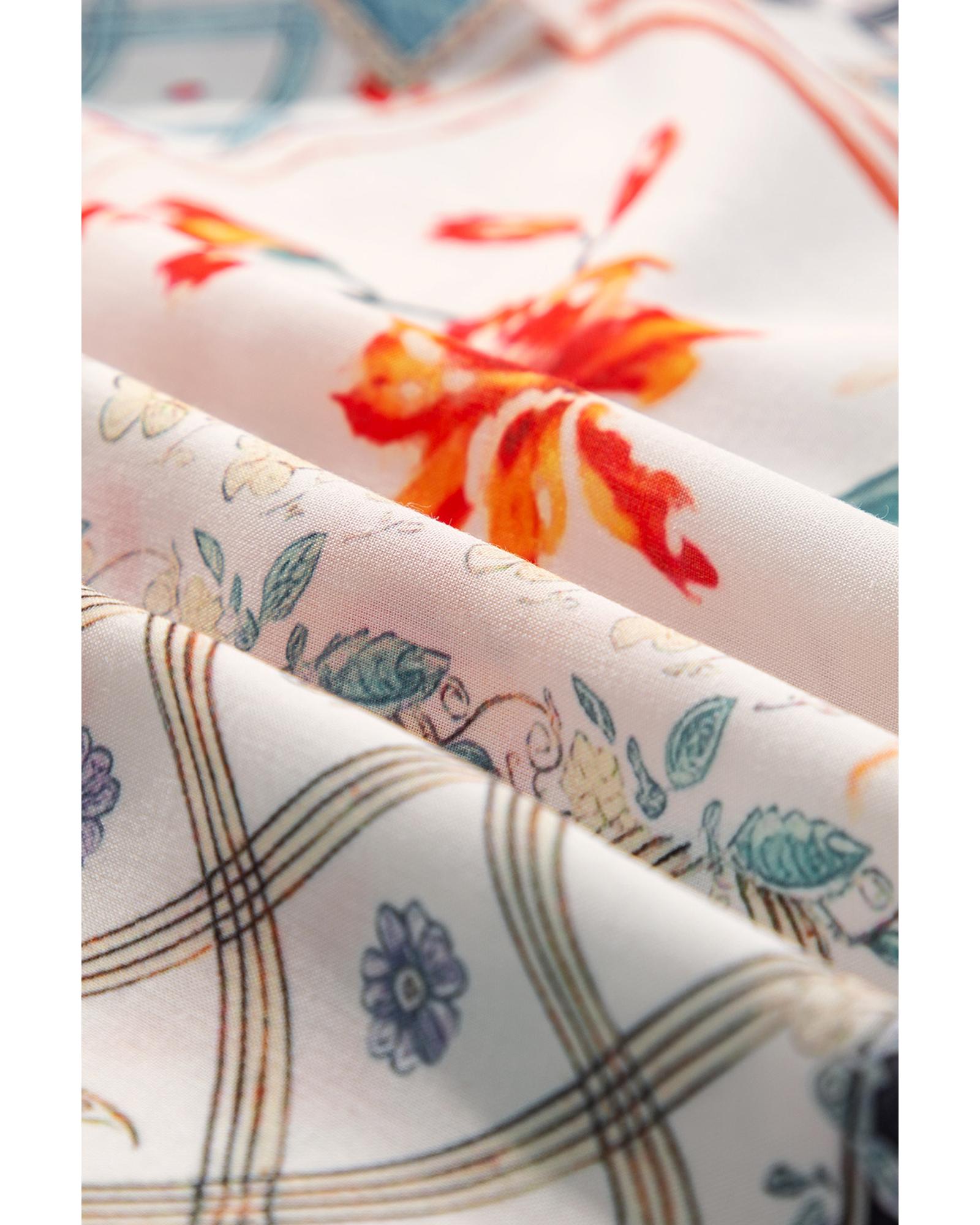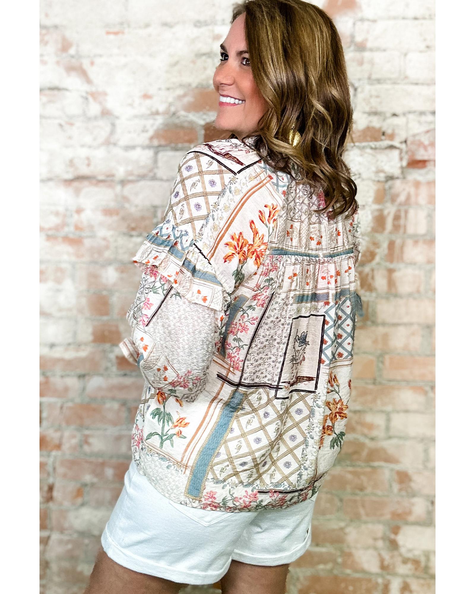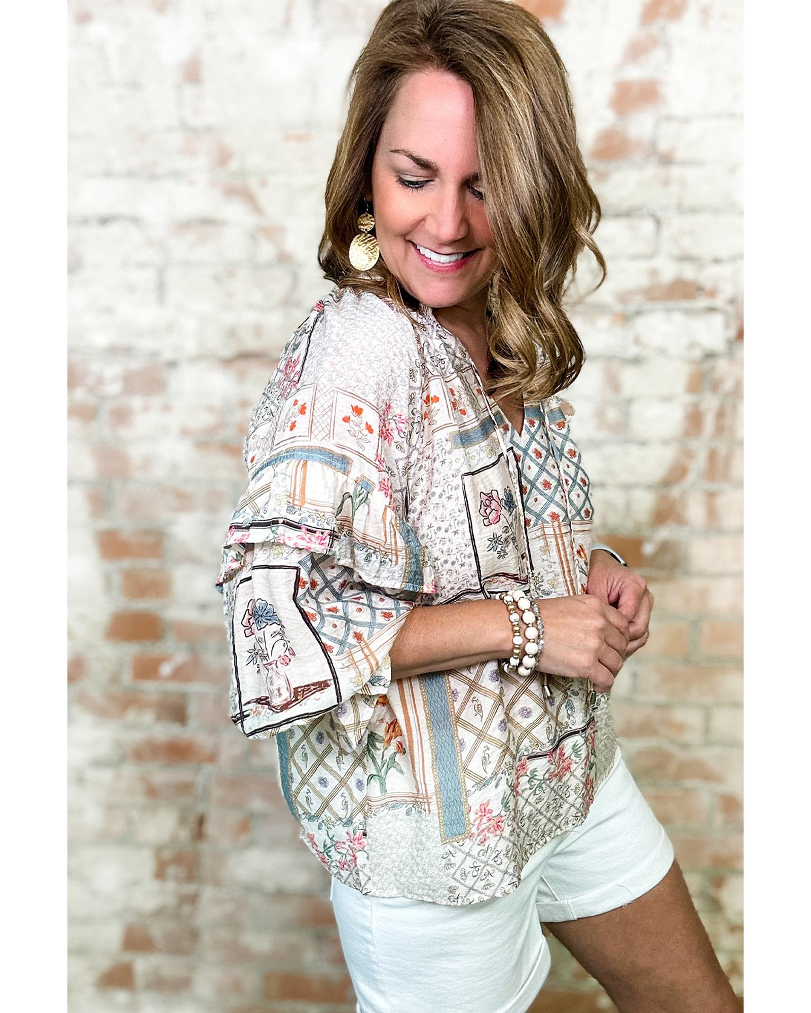 Multicolour Boho Floral Patched Ruffled Sleeve Tied Neck Blouse – S