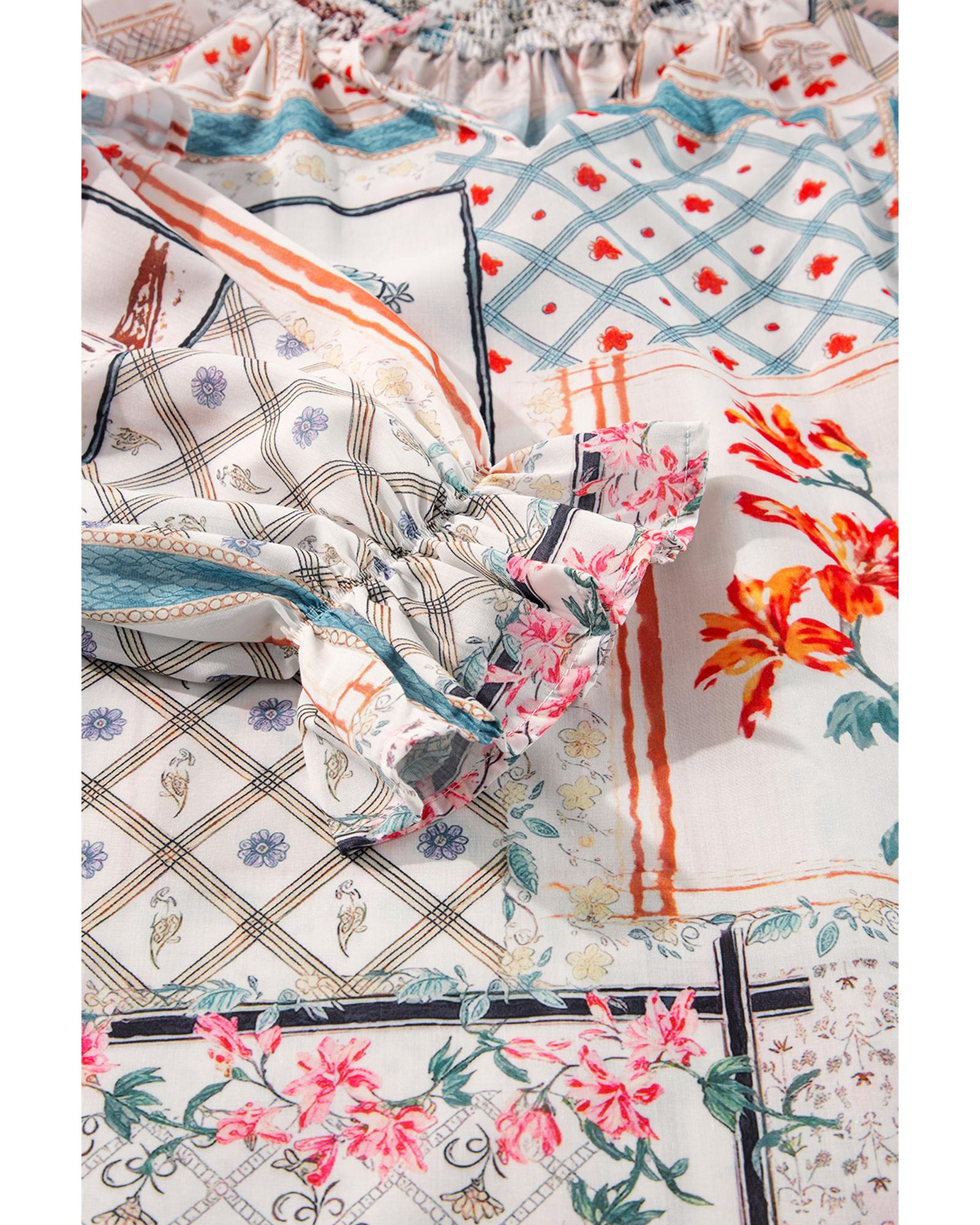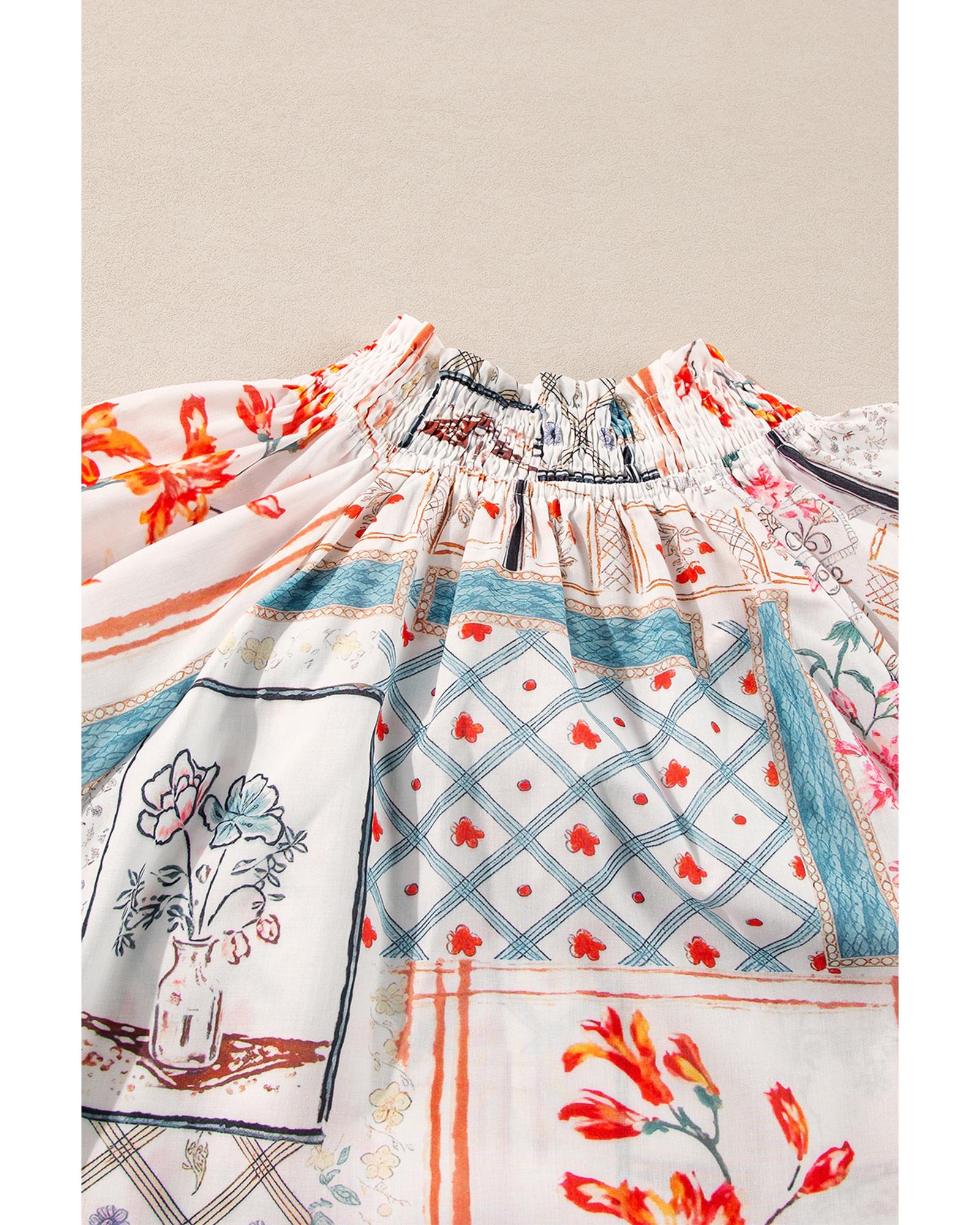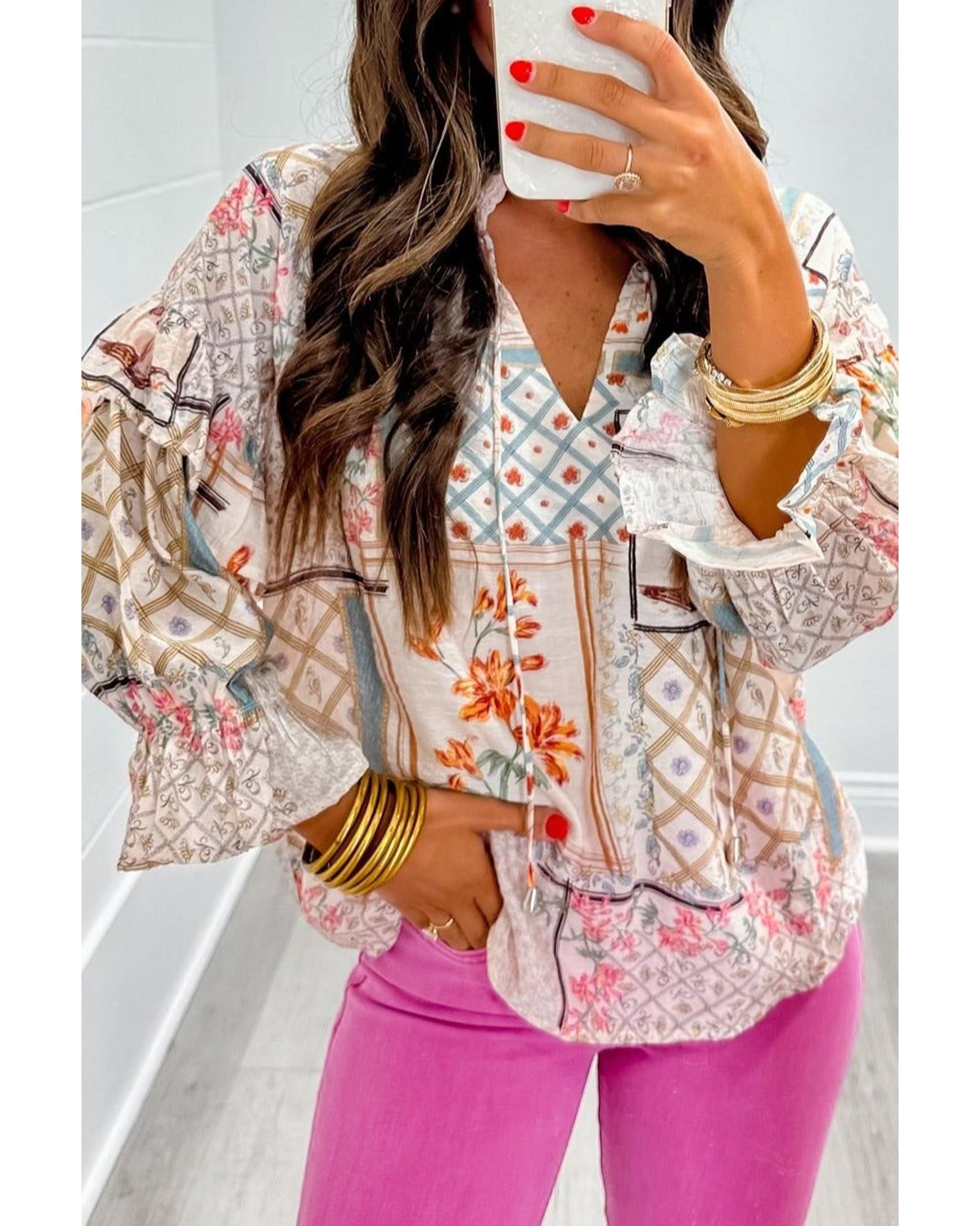 This multicolour boho blouse features floral patches and is designed to provide a trendy fitted look. With its ruffled long sleeves and tied neck, it offers a romantic and playful vibe, making it perfect for stylish everyday wear.