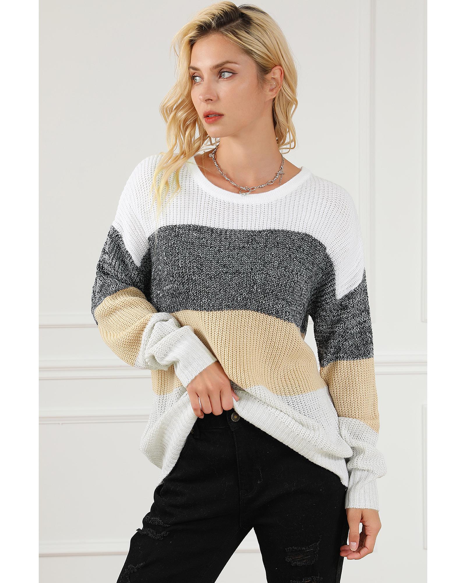 This multicolour color block drop shoulder knit sweater offers a trendy and versatile style suitable for both casual and formal occasions. Designed with a fitted look following international sizing standards, it provides a fashionable and comfortable option for various outfits.