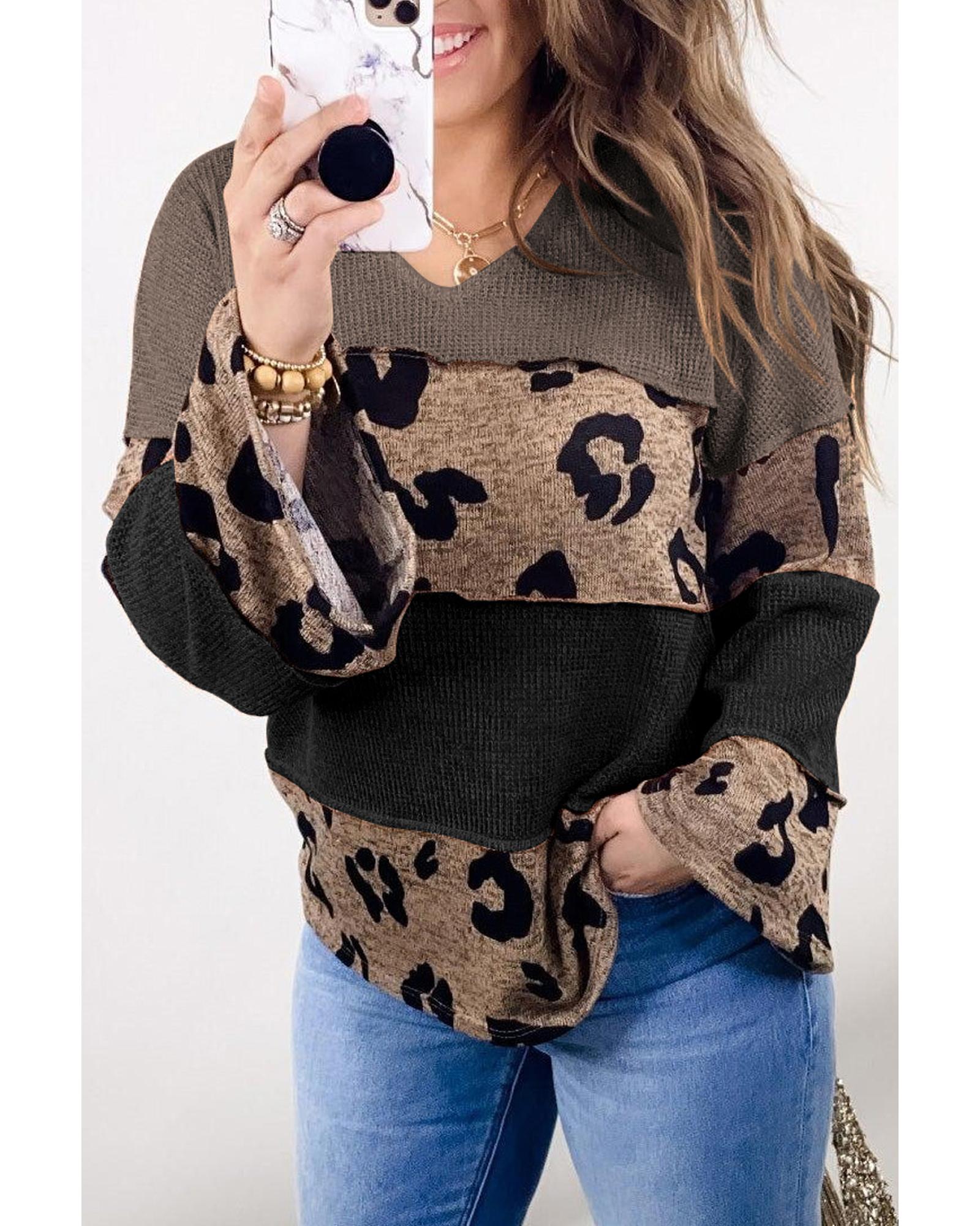 Apricot Leopard Splicing Exposed Seam Waffle Knit Top - M
