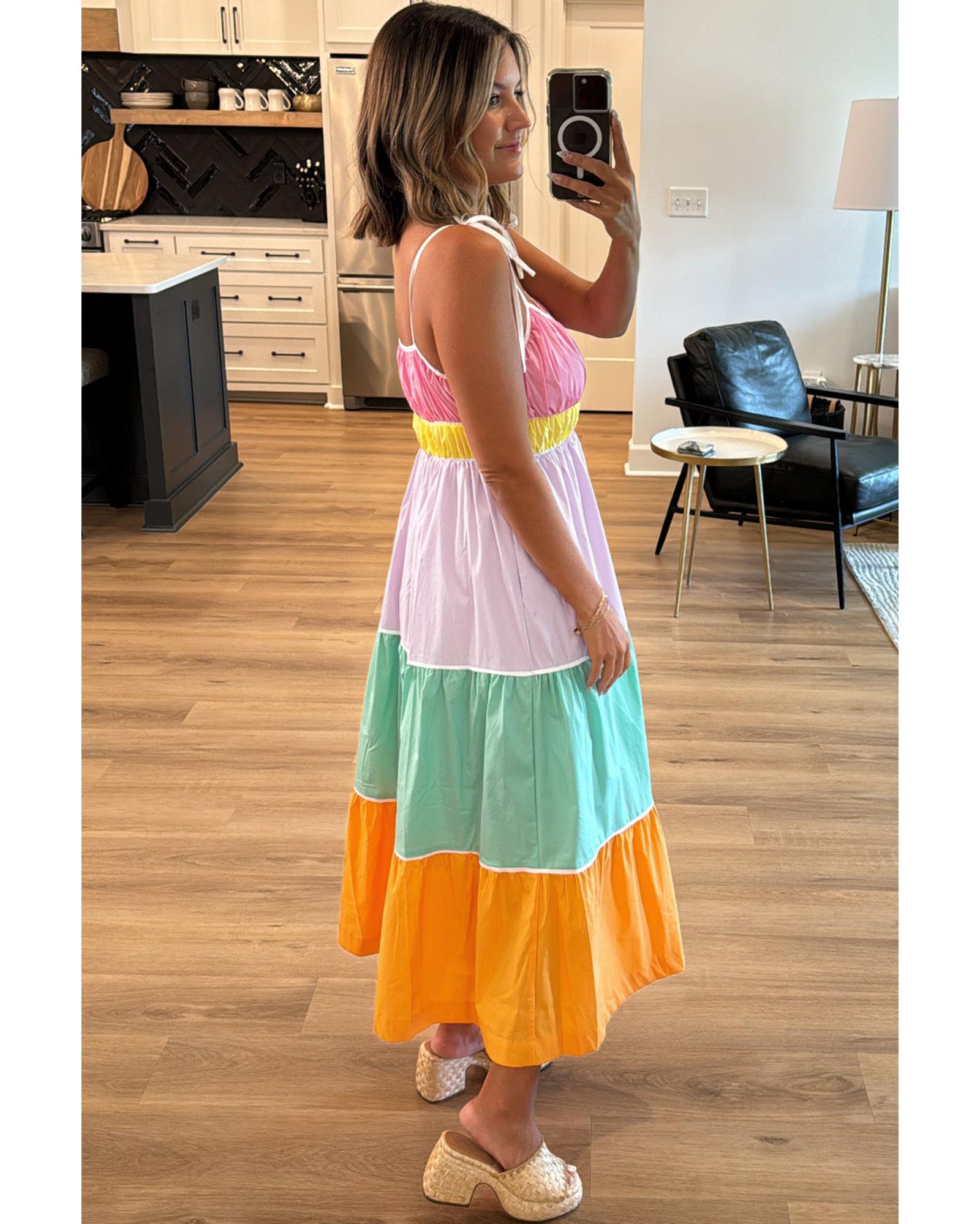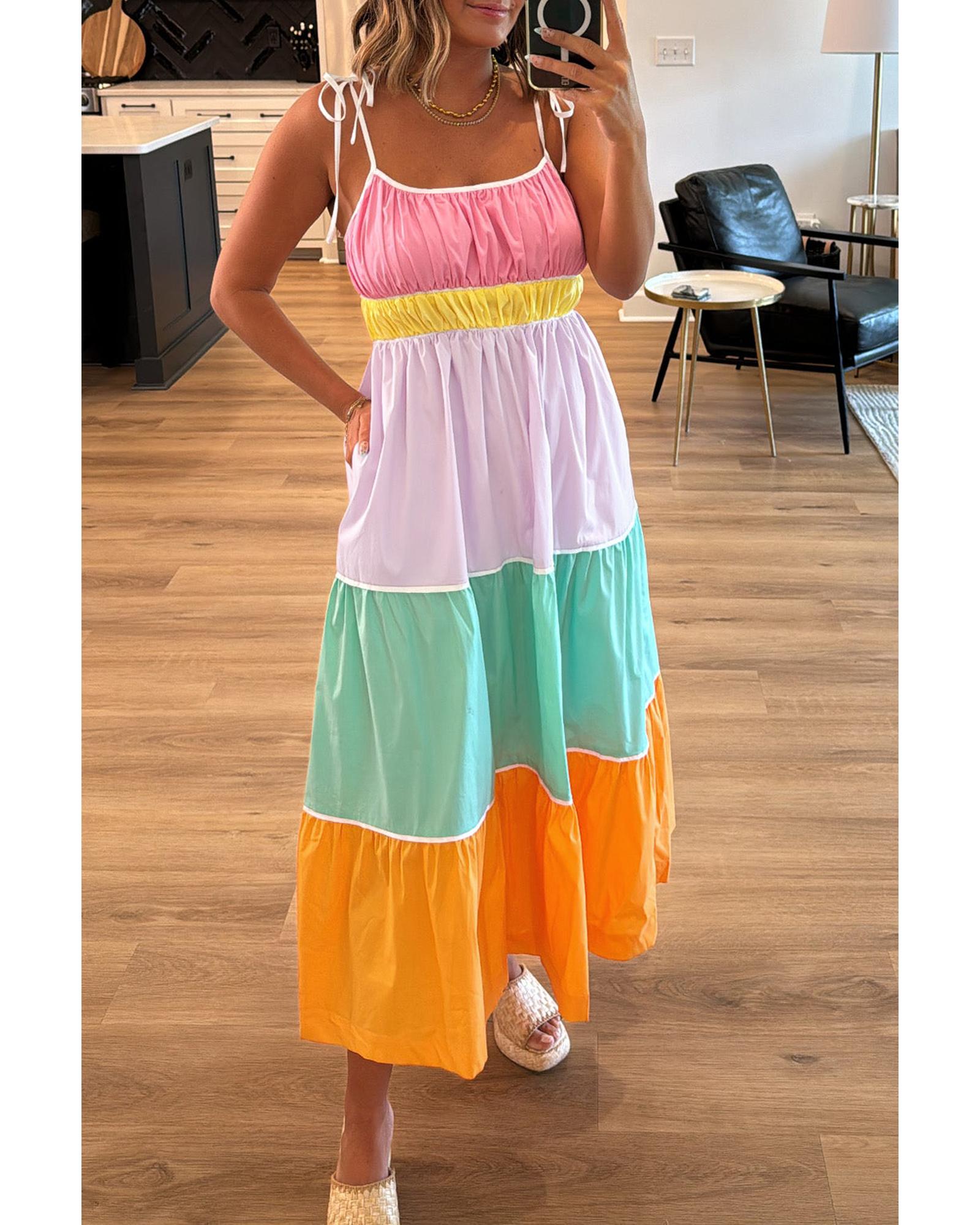 This maxi dress features a multicolour colorblock design with a high waist and flowy length, offering a stylish and comfortable look suitable for both casual and special occasions. It includes self-tie straps and pockets, combining fashion with practicality.