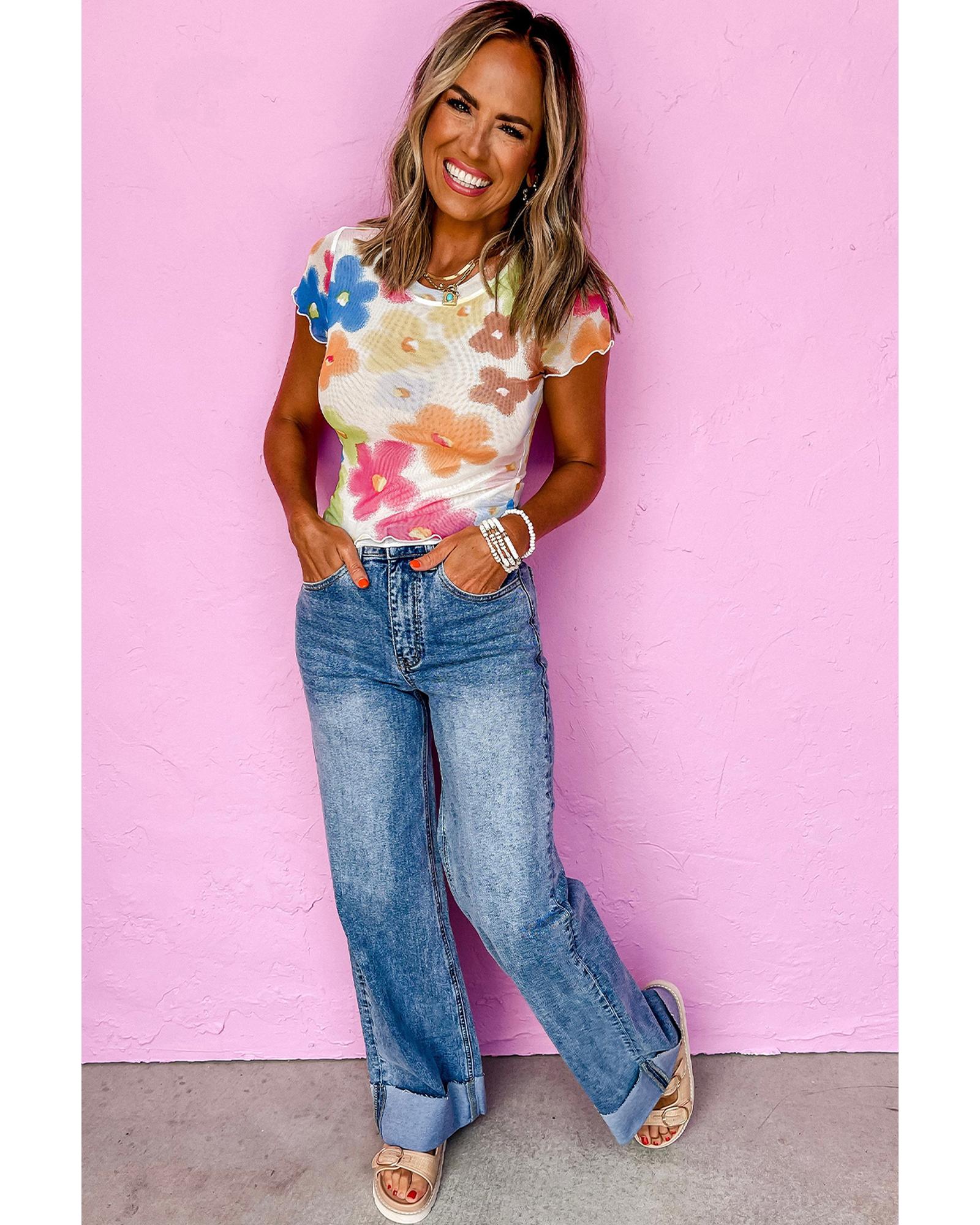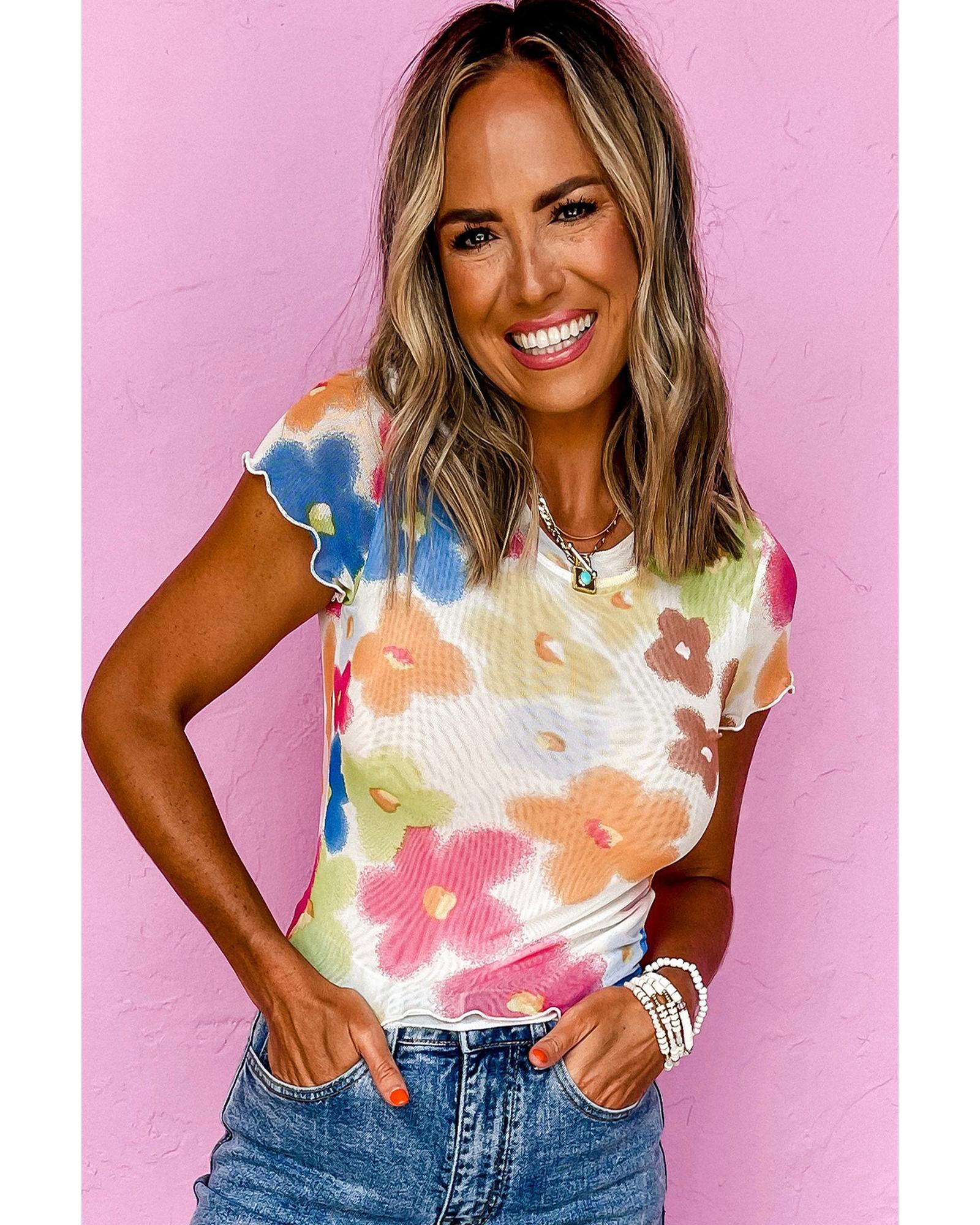 This multicolour floral mesh cropped T-shirt features a trendy fitted design with a sheer fabric that creates a sexy silhouette. The elegant floral pattern and delicate lettuce trim add a touch of femininity, making it a stylish choice for various outfits. The cropped style is ideal for pairing with high-waisted bottoms, offering a fashionable and modern look.