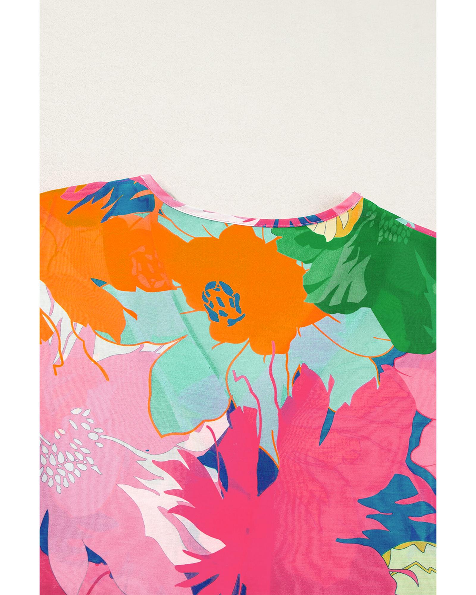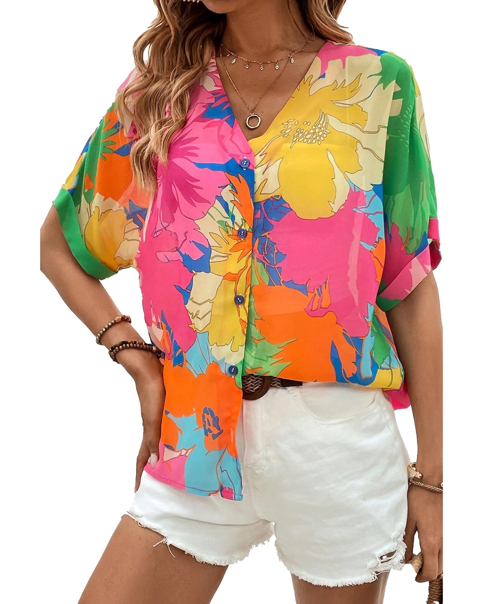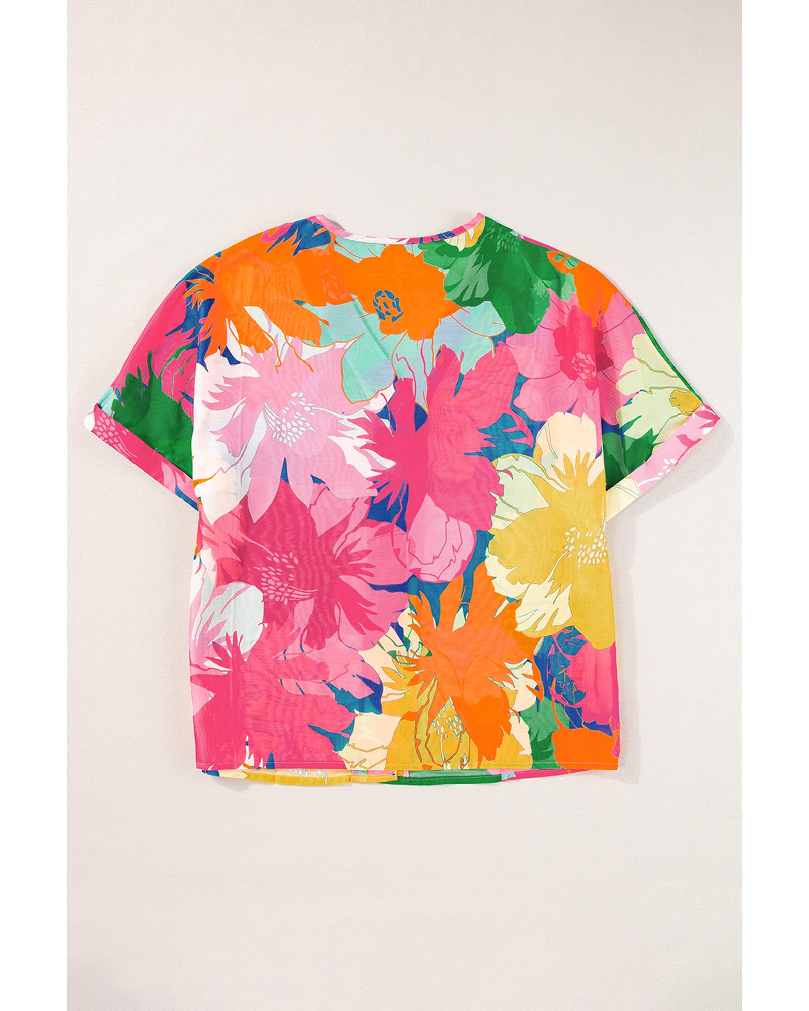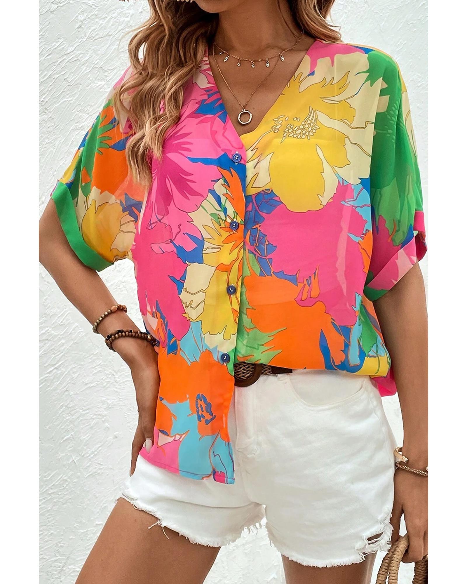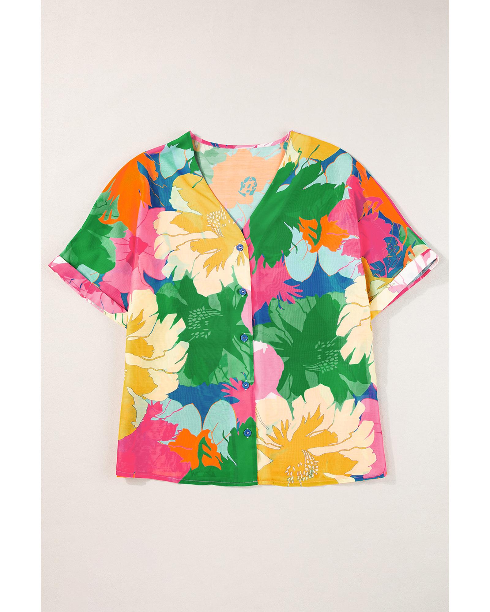 This multicolour floral print folded short sleeve shirt offers a trendy and fitted look, perfect for various casual occasions. Its chic V-neck design and folded short sleeves add a charming touch to any outfit, making it a versatile wardrobe choice.