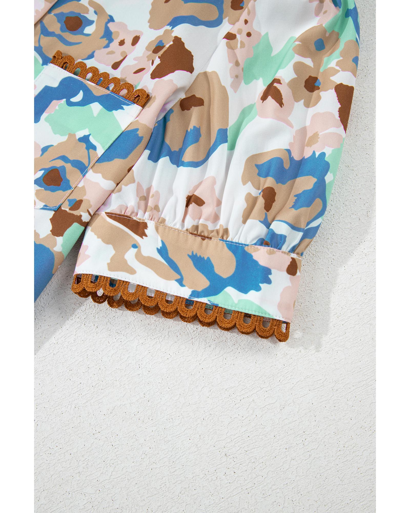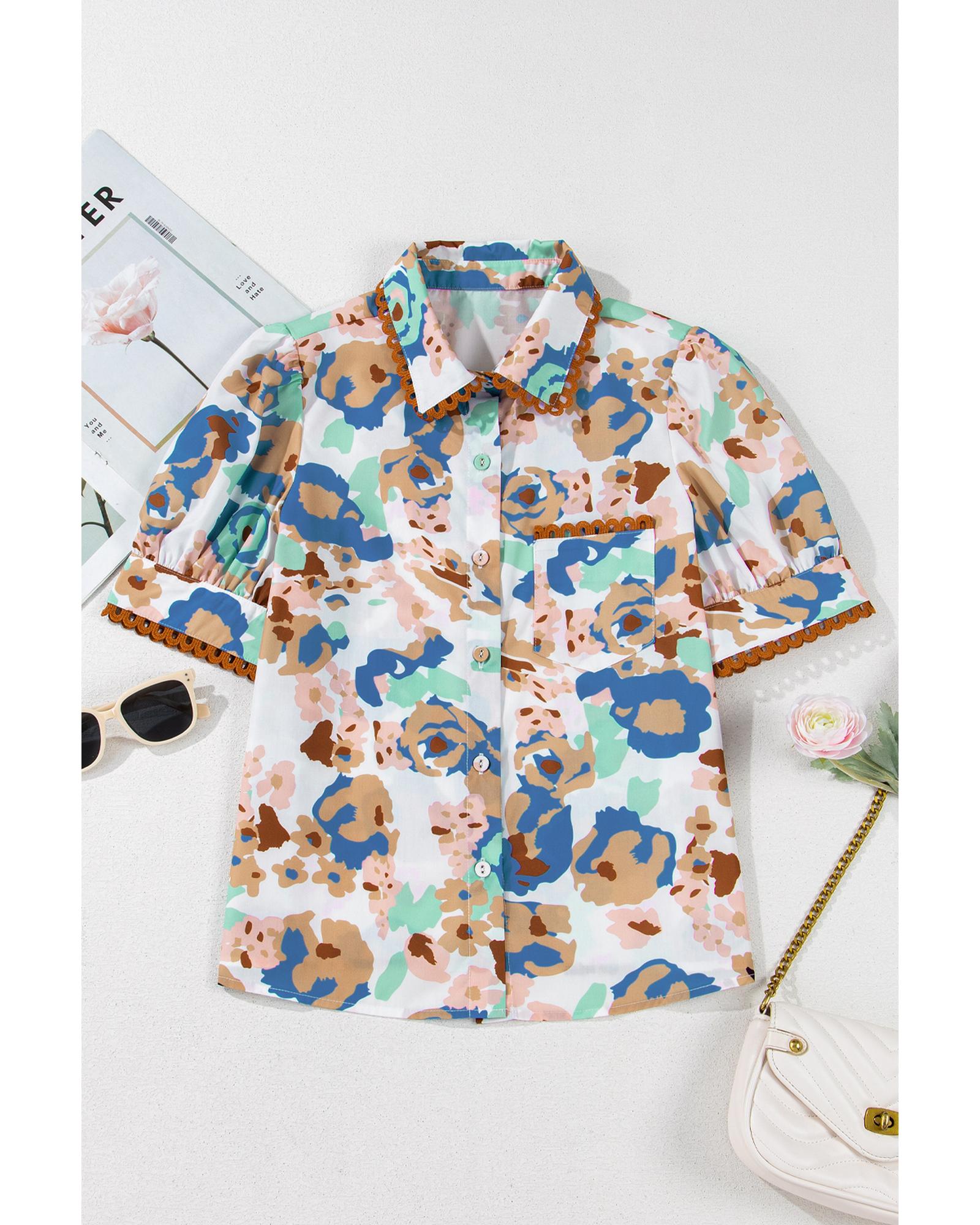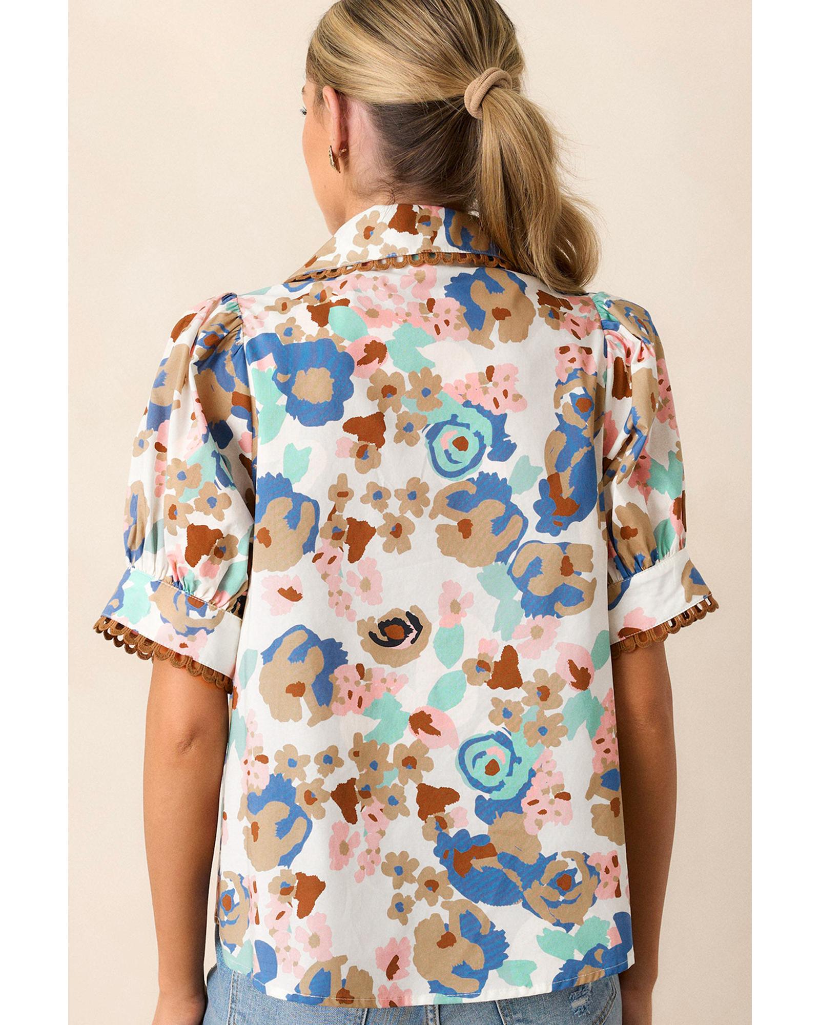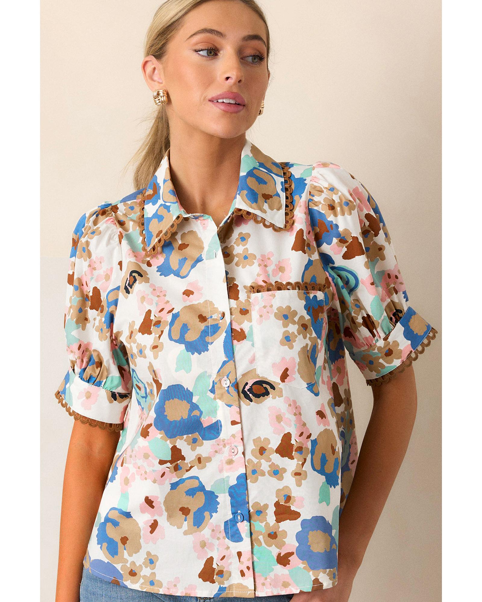 This short sleeve shirt features a multicolour floral print with a classic collared design, combining elegance and versatility. The puff sleeves add a romantic touch, while the ricrac trim provides a unique texture and style, making it suitable for various occasions.