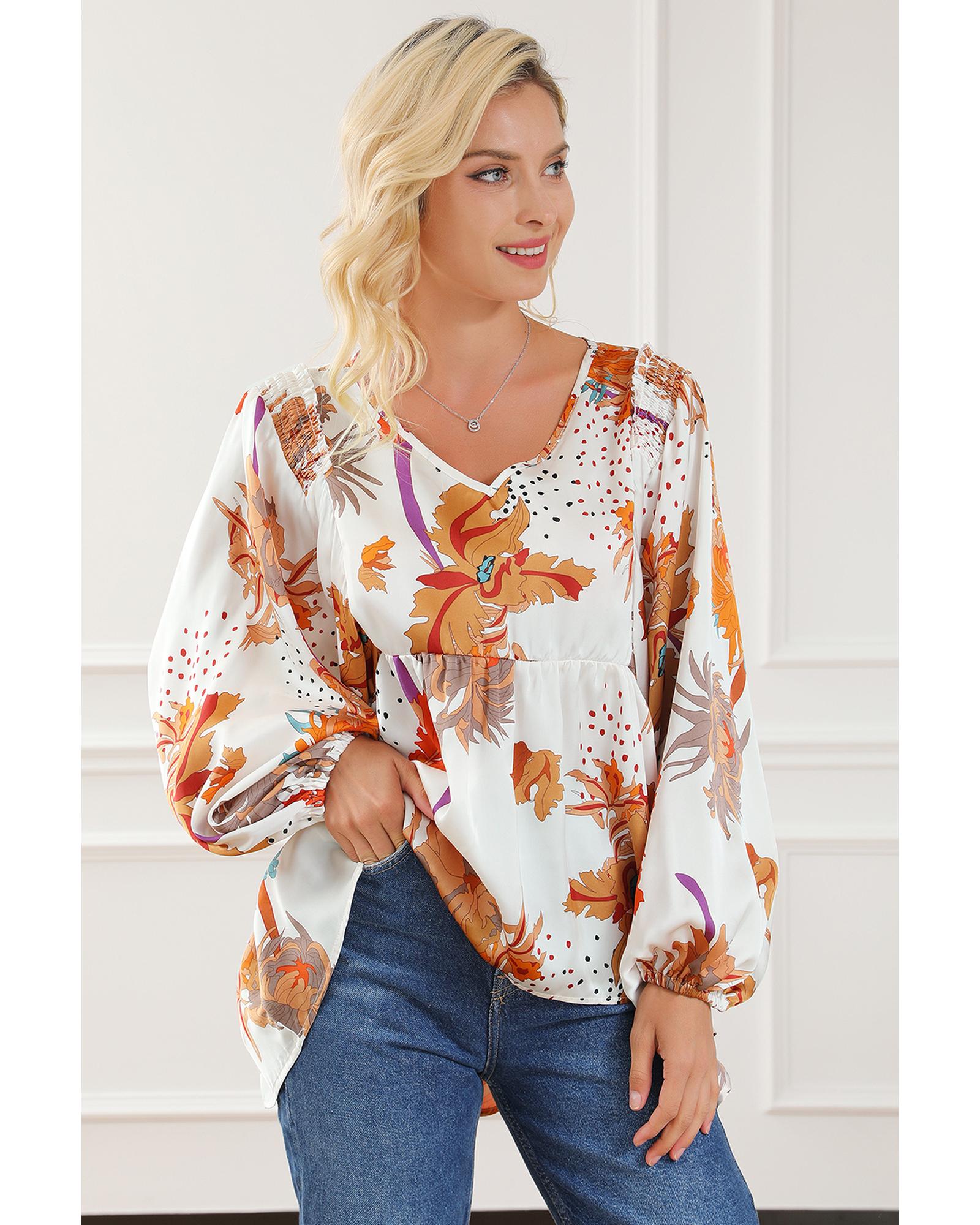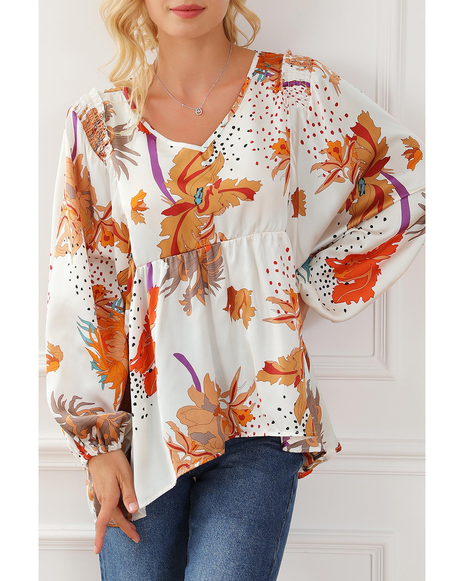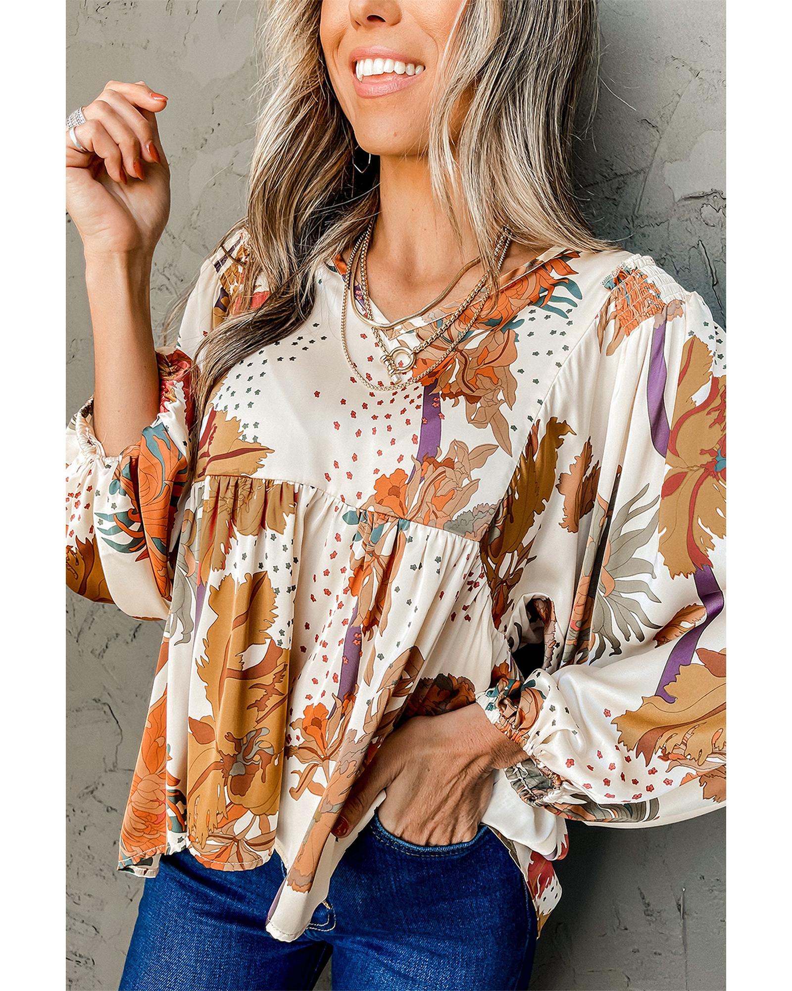 This multicolour floral print V neck babydoll blouse combines trendy style with comfort. Its versatile design makes it suitable for both casual and formal occasions, offering a fashionable and breathable fit.