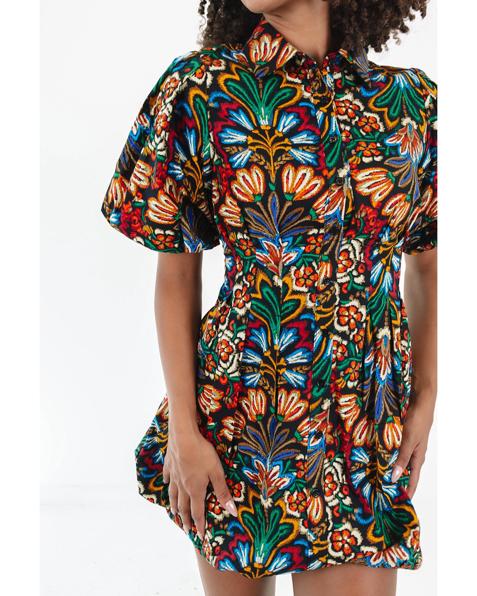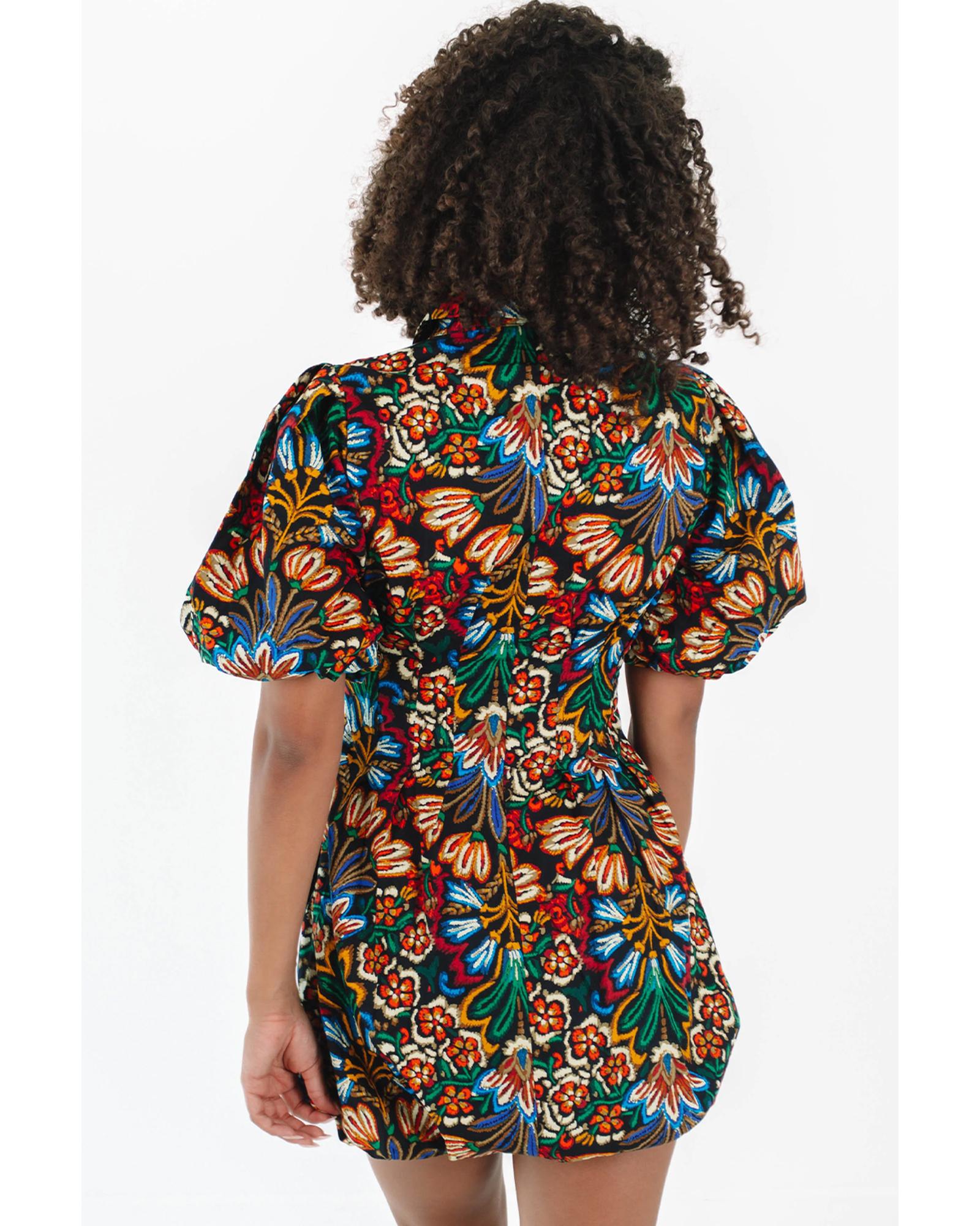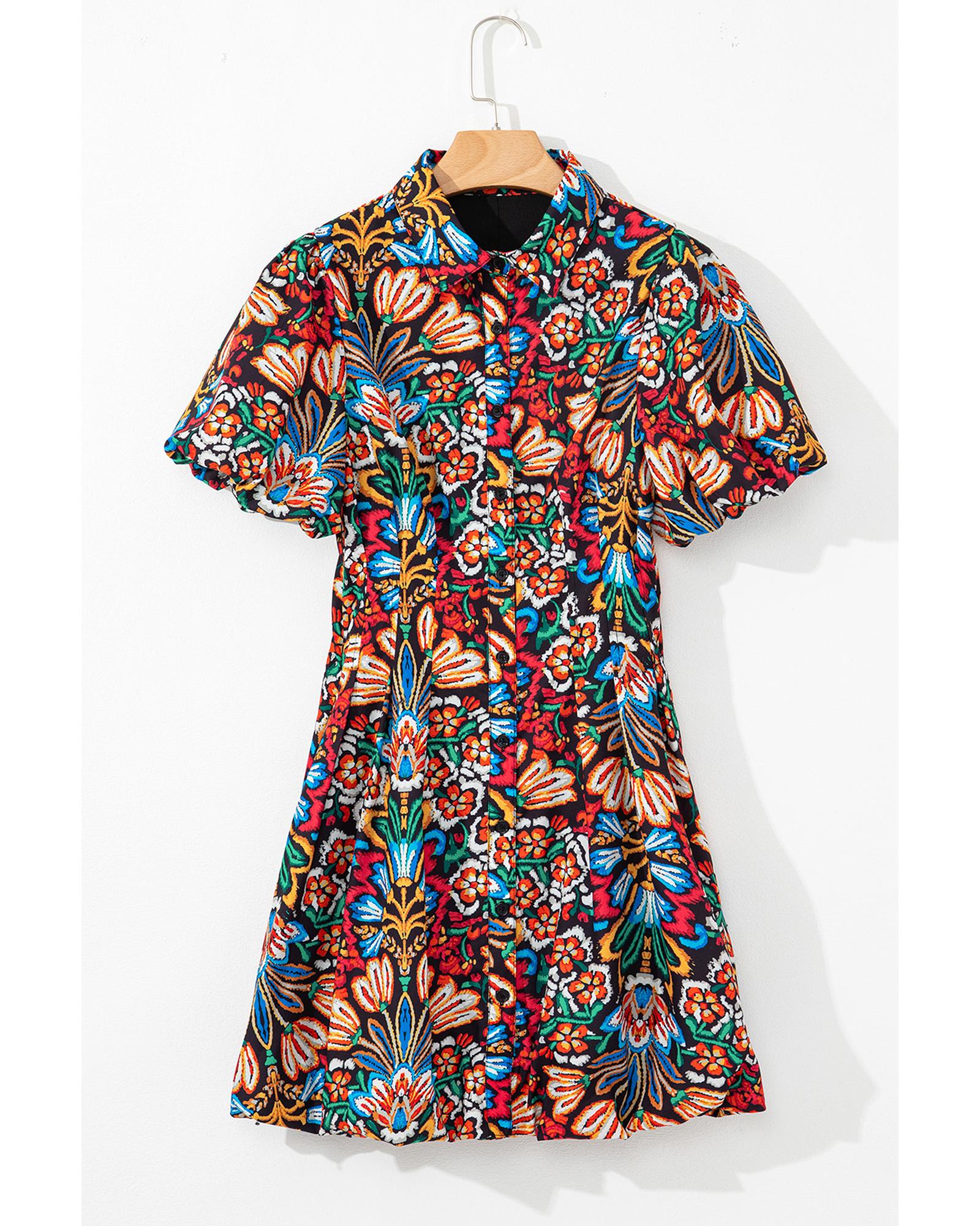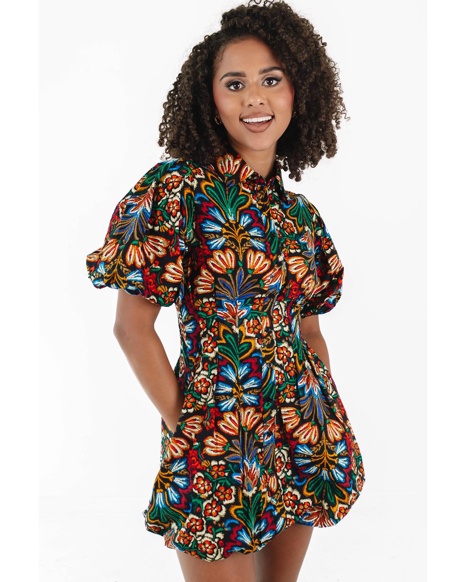 This multicolour floral puff short sleeve shirt mini dress features a vibrant floral print and a boho style design. It combines a collared button front with down styling, making it suitable for various occasions. The dress offers a comfortable fit with puff short sleeves, a pleated waistline, and a bubble hem, creating a fashionable and playful look.